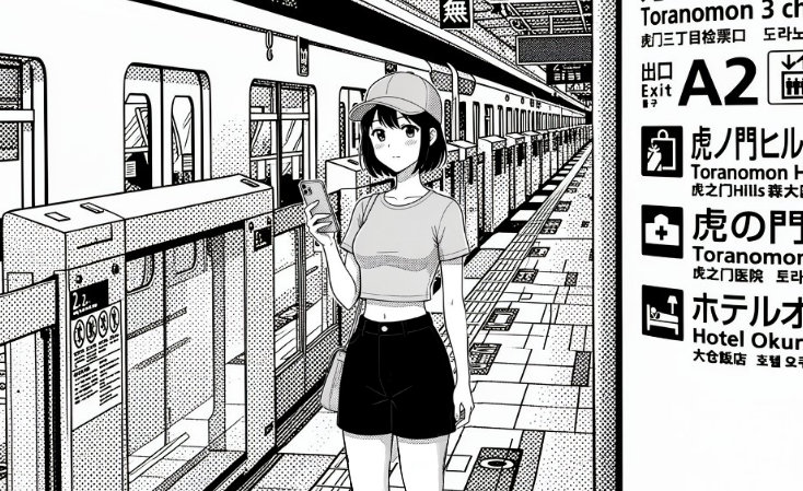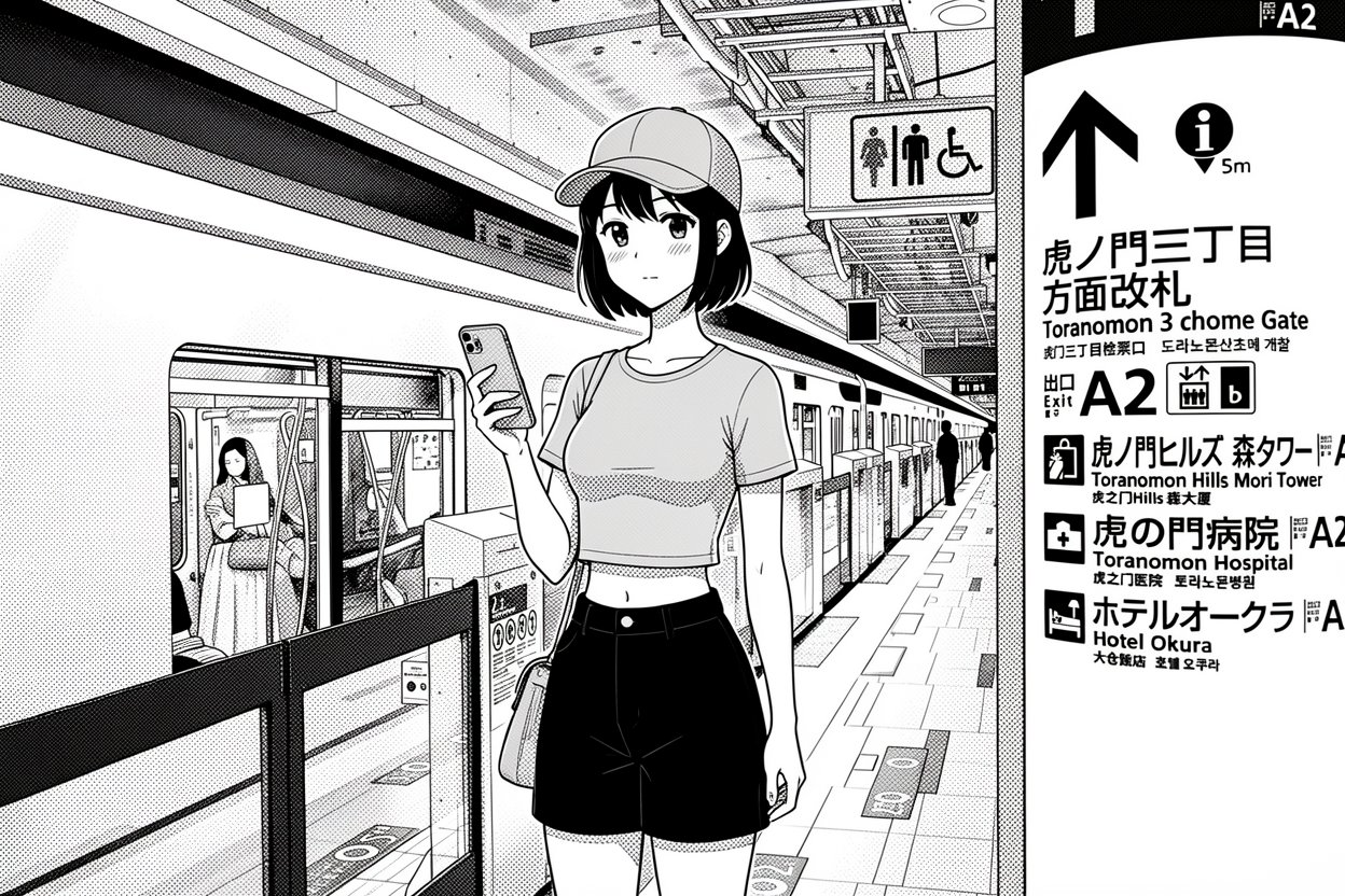 A young woman is standing on a subway platform in the @image1. She is short black hair, wearing a light gray cap, a light colored cropped top and short black pants. She is holding an iPhone in her left hand. # background There are signs, Braille blocks and blurred figures, with a sense of urban transit in the subway station. There is a sign written "出口" on it. # style japanese manga, line art, pen art, black and white, halftone