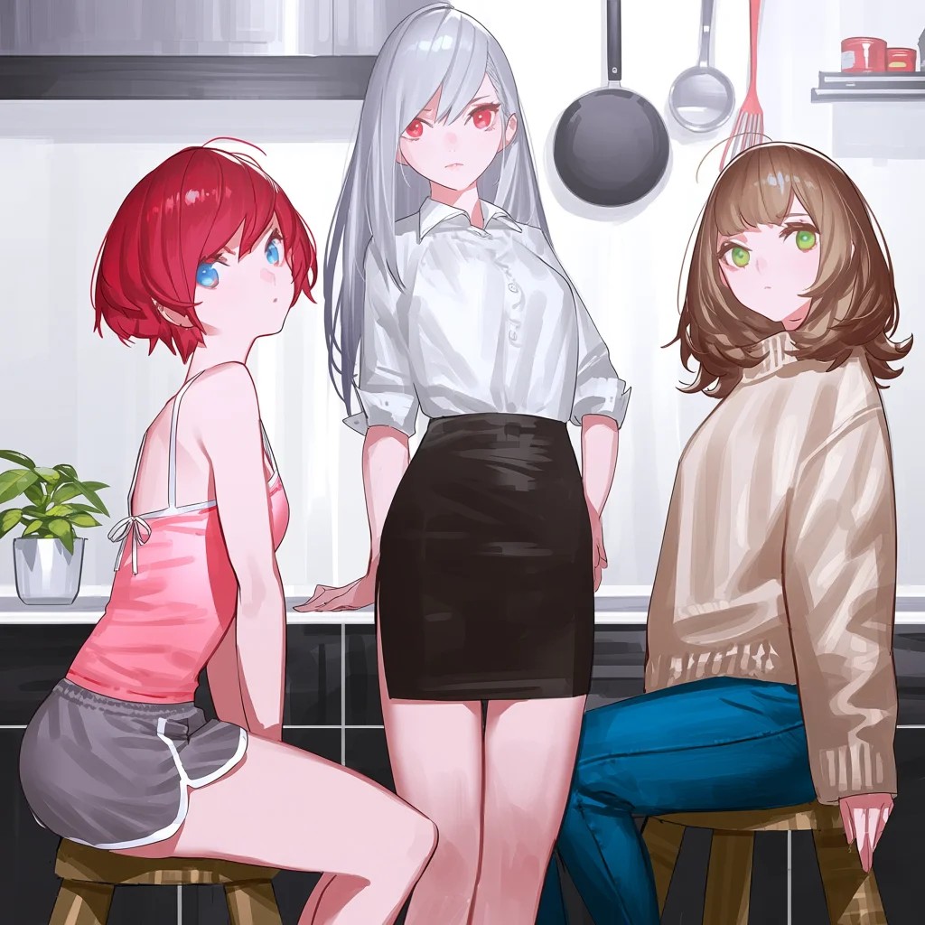 masterpiece, best quality, @アーティストタグ. There are three girls in a room. The girl on the left has short red hair and blue eyes. She is sitting on a stool. She is wearing a pink camisole and gray dolphin shorts. The girl in the middle has long silver hair and red eyes. She is standing. She is wearing a white collared shirt and a black pencil skirt. The girl on the right has medium brown hair and green eyes. She is sitting on a stool. She is wearing a beige sweater and a blue denim. There is a potted plant, a frying pan on the kitchen wall in the background. ネガティブプロンプト worst quality, low quality, score_1, score_2, score_3, blurry, jpeg artifacts, sepia