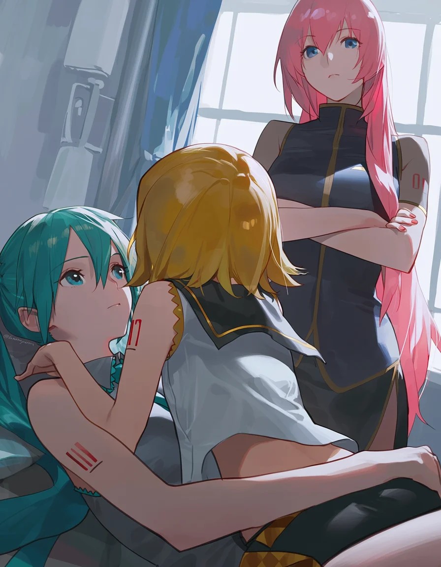 @アーティストタグ, masterpiece, best quality, 3girls, hatsune miku is wearing a grey shirt with bare shoulders. She is lying on back. kagamine rin with short blonde hair wearing a sailor shirt. girl on top. She is straddling on hatsune miku. megurine luka with pink long hair with crossed arms. She is standing behind them. She is looking at the girls. # background indoors, window, curtain, ネガティブプロンプト worst quality, low quality, score_1, score_2, score_3, blurry, jpeg artifacts, sepia