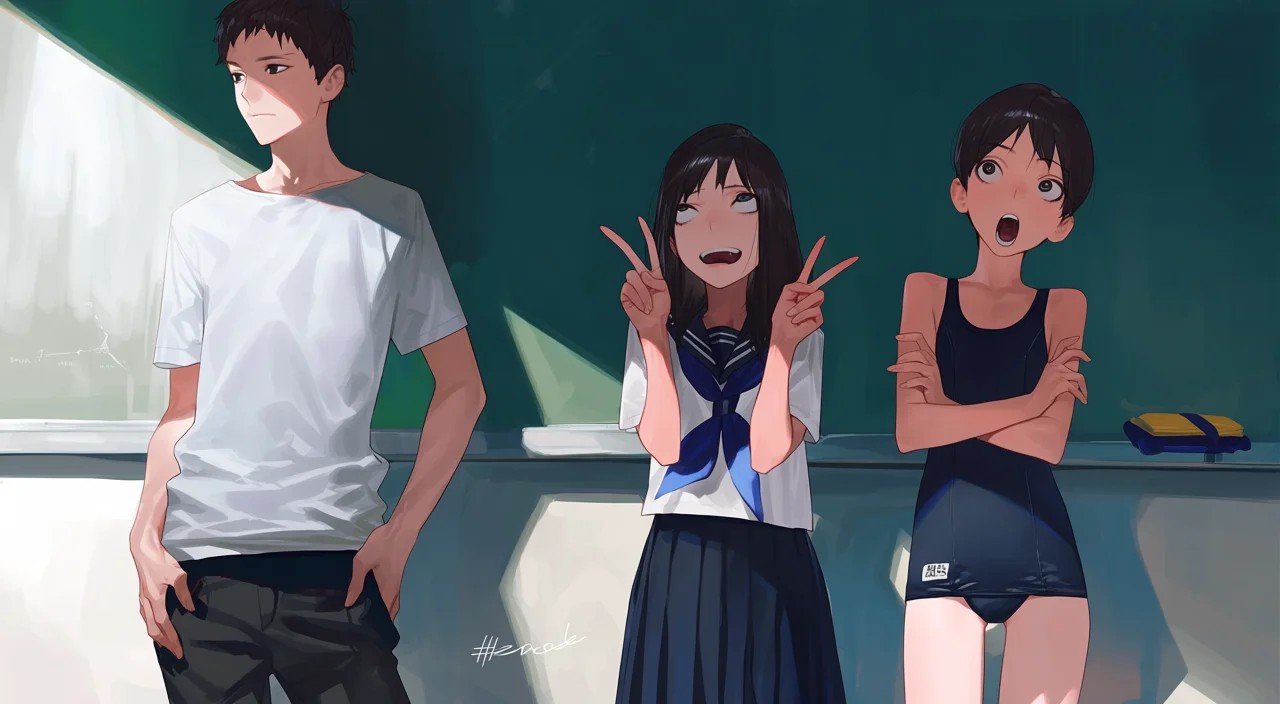 @アーティストタグ, masterpiece, best quality, 2boys, 1girl, The three of them are lined up in a row. # girl The standing girl is wearing a school uniform, ahegao, double v. # boy 1 A standing boy wearing a t-shirt and pants is expressionless and looking looking outside(left) on the left. # boy 2 Another boy wearing a school swimsuit is looking at the girl with surprising, open mouth. He is standing on the right. crossed arms. # background indoors, classroom, chalkboard ネガティブプロンプト worst quality, low quality, score_1, score_2, score_3, blurry, jpeg artifacts, sepia, sketch