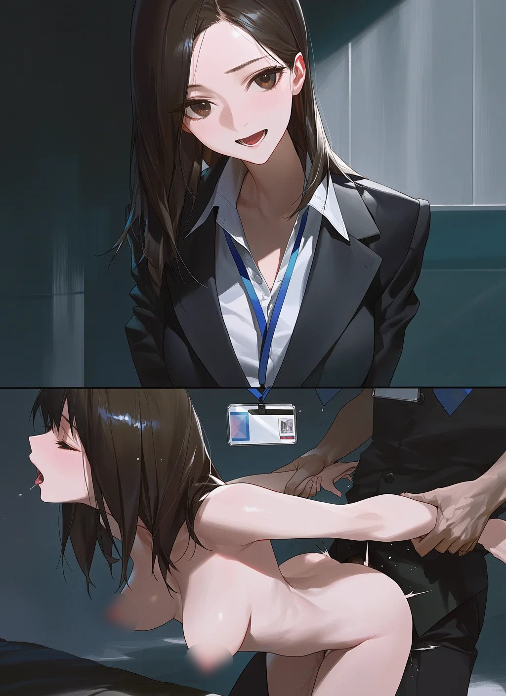 @アーティストタグ, masterpiece, best quality, 2koma, comic, 1girl, 1boy, indoors # koma 1 1girl, solo, :D, seductive smile, brown eyes, long eyelashes, looking at viewer, portrait, collared shirt, suit jacket, id card, straight-on, head tilt # koma 2 from side, nude, sex from behind, holding another's wrist, doggy style, torogao, perky breasts, ass, closed eyes ネガティブプロンプト worst quality, low quality, score_1, score_2, score_3, blurry, jpeg artifacts, sepia, sketch, english text, engrish text, chinese text, korean text
