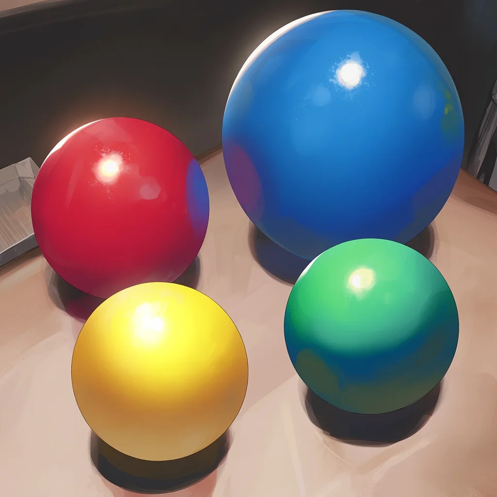 @アーティストタグ, masterpiece, best quality, indoors. There are four balls on a table. A left top ball is red. A blue right top ball is twice the size of the red ball. A yellow left bottom ball is twice the size of the blue ball. A green right bottom ball is twice the size of the yellow ball. ネガティブプロンプト worst quality, low quality, score_1, score_2, score_3, blurry, jpeg artifacts, sepia, sketch, english text, engrish text, chinese text, korean text