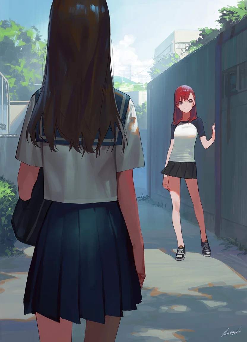 @アーティストタグ, masterpiece, best quality, 2girls, outdoors. A girl with brown hair wearing a school uniform is standing. Another girl with red hair wearing a t-shirt and a skirt is standing behind the girl far away.