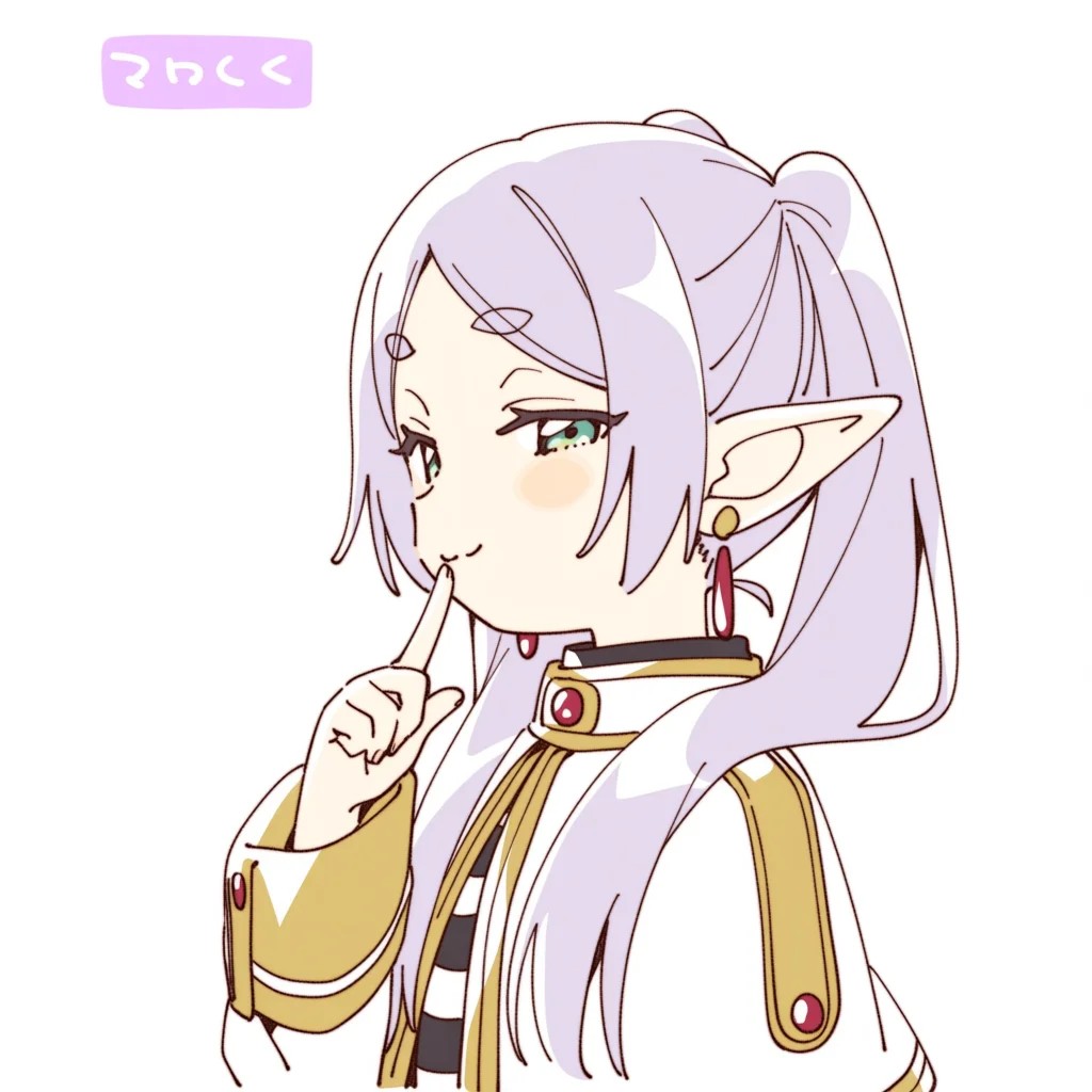 @アーティスト名, 1girl, chibi, portrait, white background frieren, capelet, floating earrings, gold trim, green eyes, pointy ears, sleeve cuffs, smile, striped shirt, finger to mouth, sideways glance, looking at viewer, half-closed eyes ネガティブプロンプト backlighting, worst quality, low quality, score_1, score_2, score_3, score_4, blurry, jpeg artifacts, sepia, sketch, english text, engrish text, chinese text, korean text