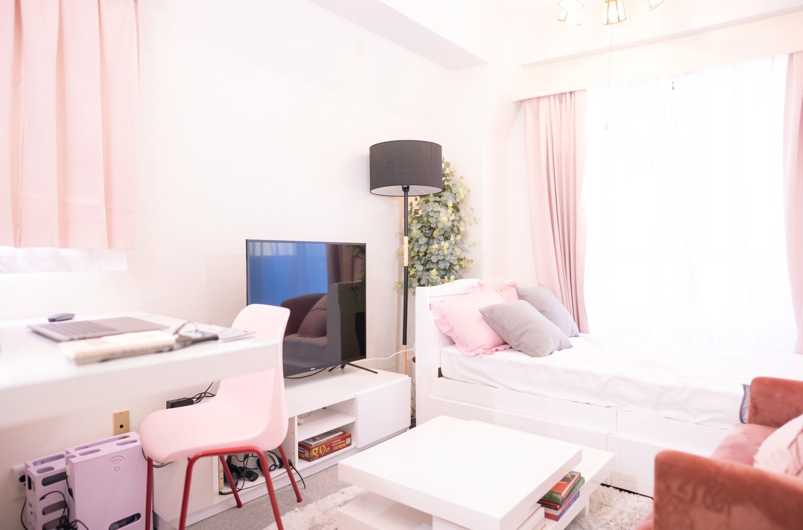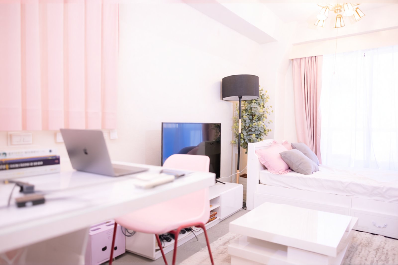 Rotate the camera 30 degrees to the right. There are some english books on the white teble in the left side.
