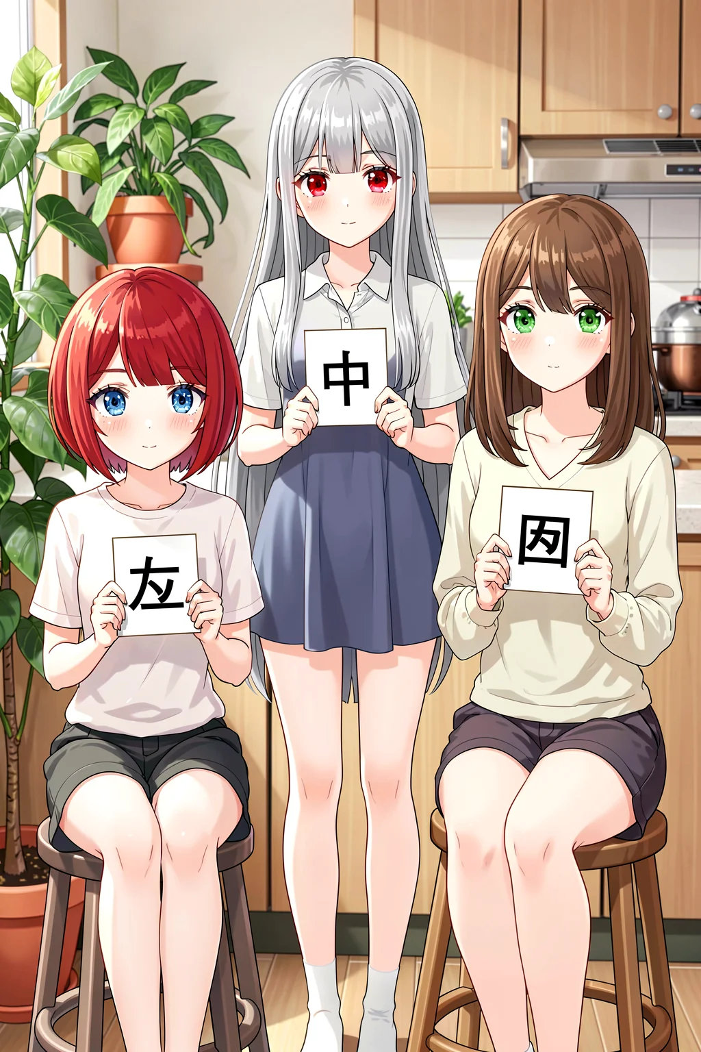 # person There are three girls in a room. - left: short red hair and blue eyes. She is sitting on a stool holding a card with the word "左" written on it. - middle: long silver hair and red eyes. She is standing and holding a card with the word "中" written on it in both hands. - right: medium brown hair and green eyes. She is sitting on a stool and holding a card with the word "右" written on it. # background potted plants and a kitchen. # style Anime style.