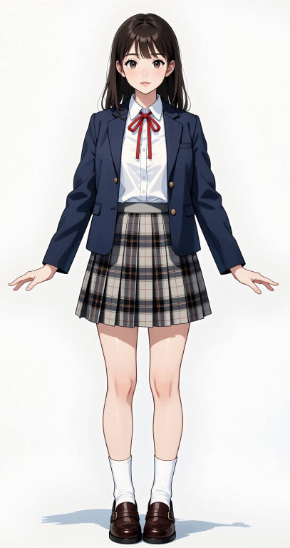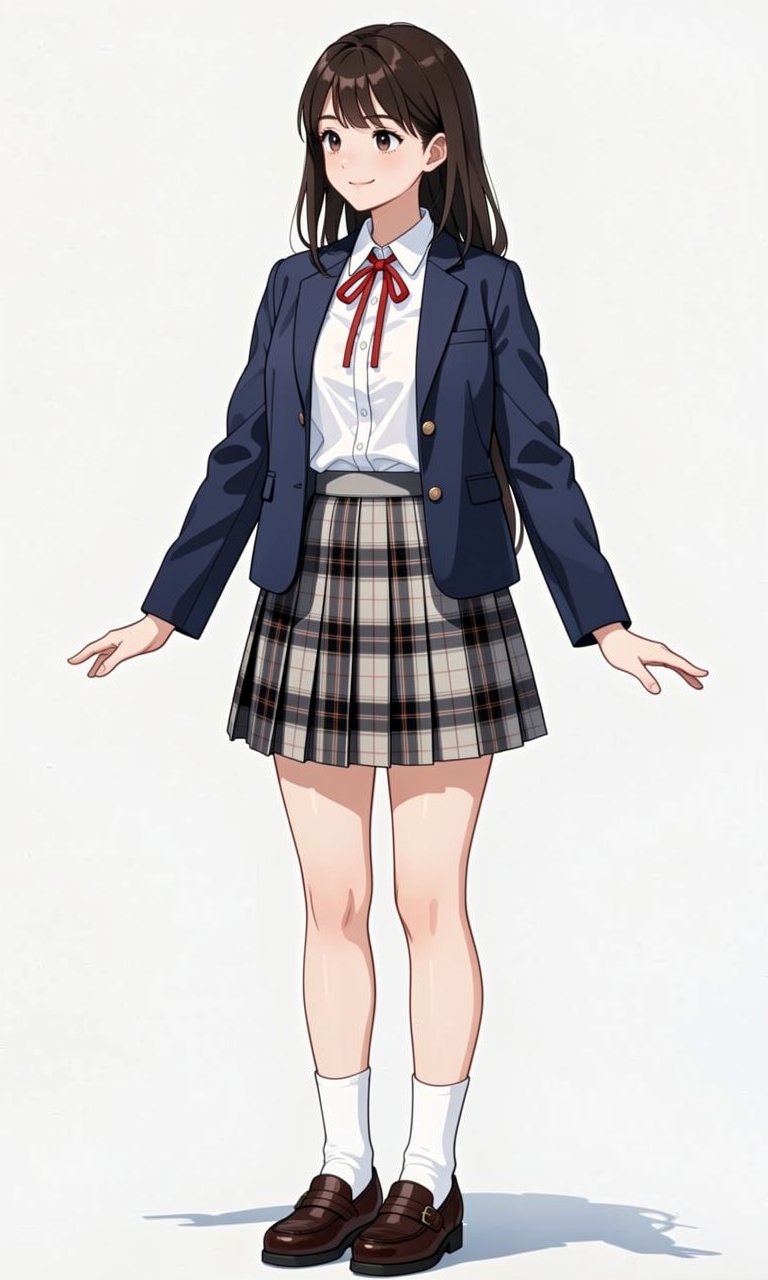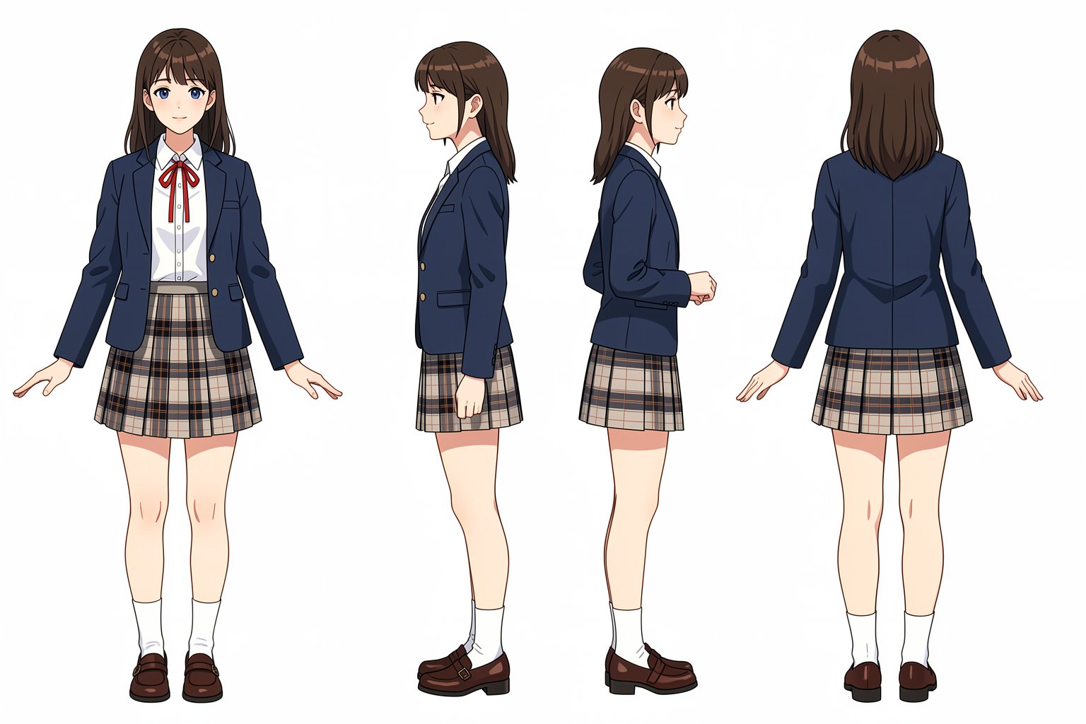 Create her reference sheet on a pure white background. Draw following four different angles: - front view on the far left - left view that facing to the left with her entire body on the middle left - right view that facing to the right with her entire body on the middle right - back view on the far right