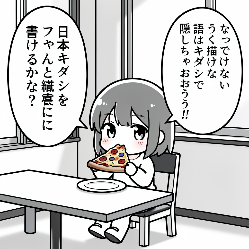 The illustration of a chibi girl sitting in a chair eating a piece of pizza. There is a table and a window in the indoor room. # speech bubbles There are two speech bubbles in vertical writing: - "日本語の フキダシを ちゃんと縦に 書けるかな?" - "うまく描けない 部分はフキダシで 隠しちゃおう!!"