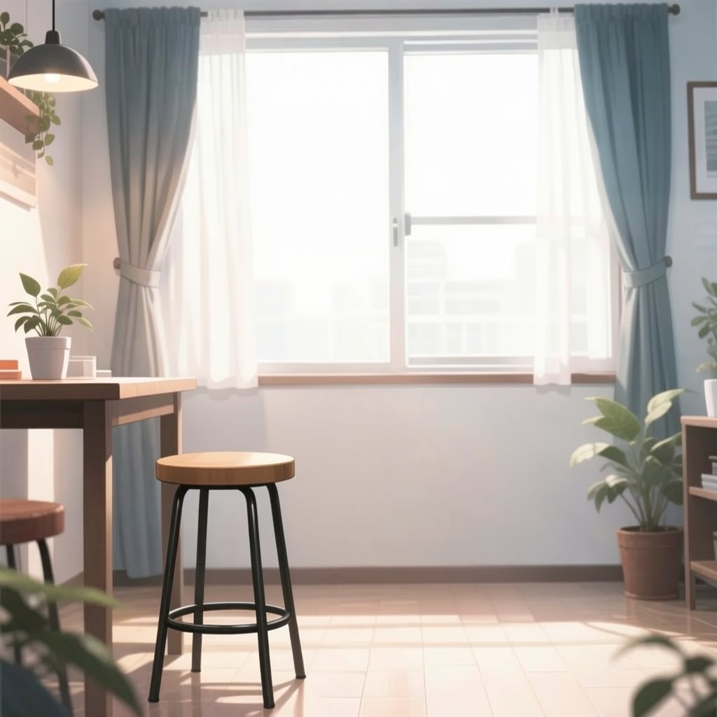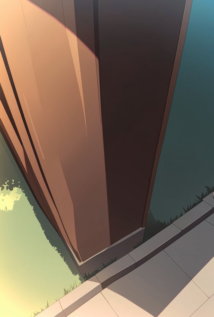 Anime style. A girl is standing in the living room. Ultra high angle and the camera is looking down at the girl. Wide shot.