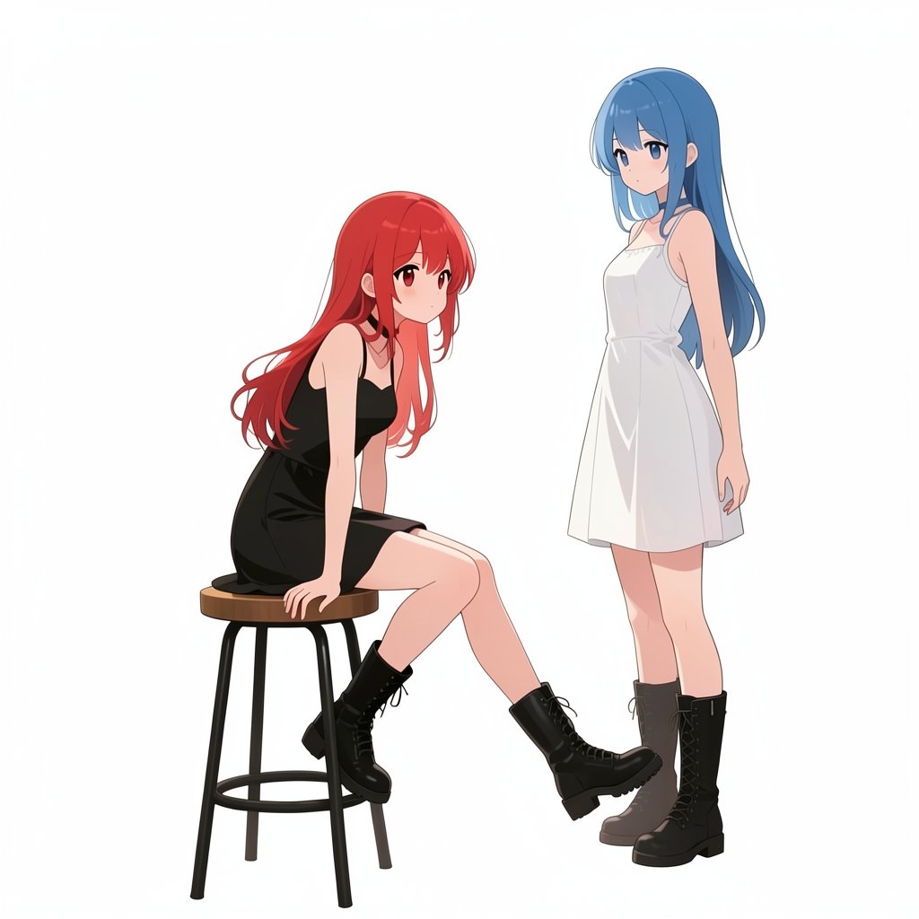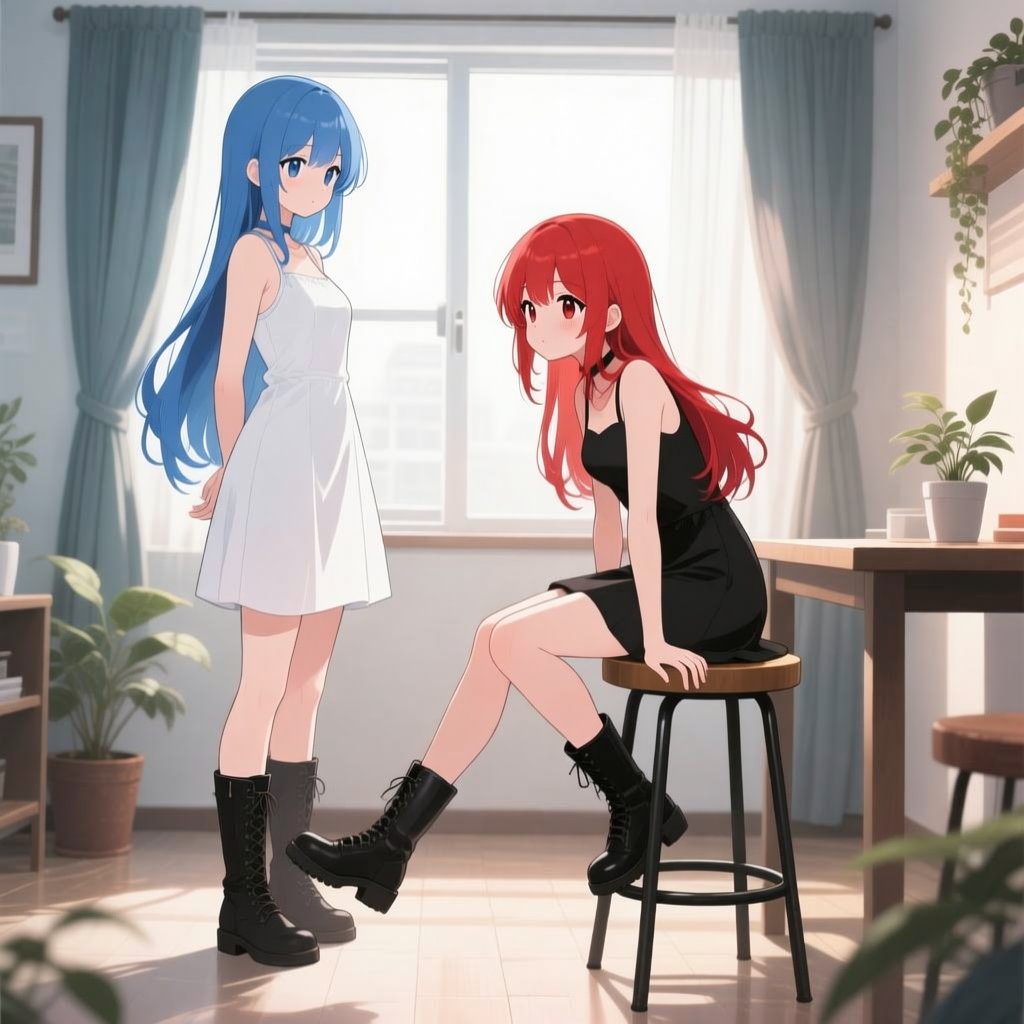 # person There are two persons. A red haired girl in image 1 facing backward in right bottom corner of image 2. A blue haired girl in image 1 facing front in far left side of image 2. # background There is a sofa, a carpet, a window, a potted plant, a clock and a sofa.