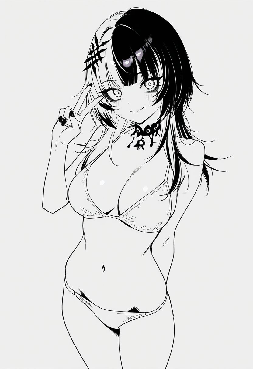 Coloring the image 1. *Keep the input lines and black tone*. Use sharp lines. The base color of her bikini is hex #A3D6E9. Her hair is black and white. The base color of her skin is hex #FDE7DA.