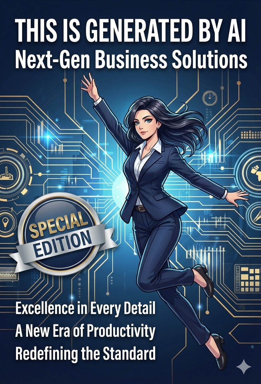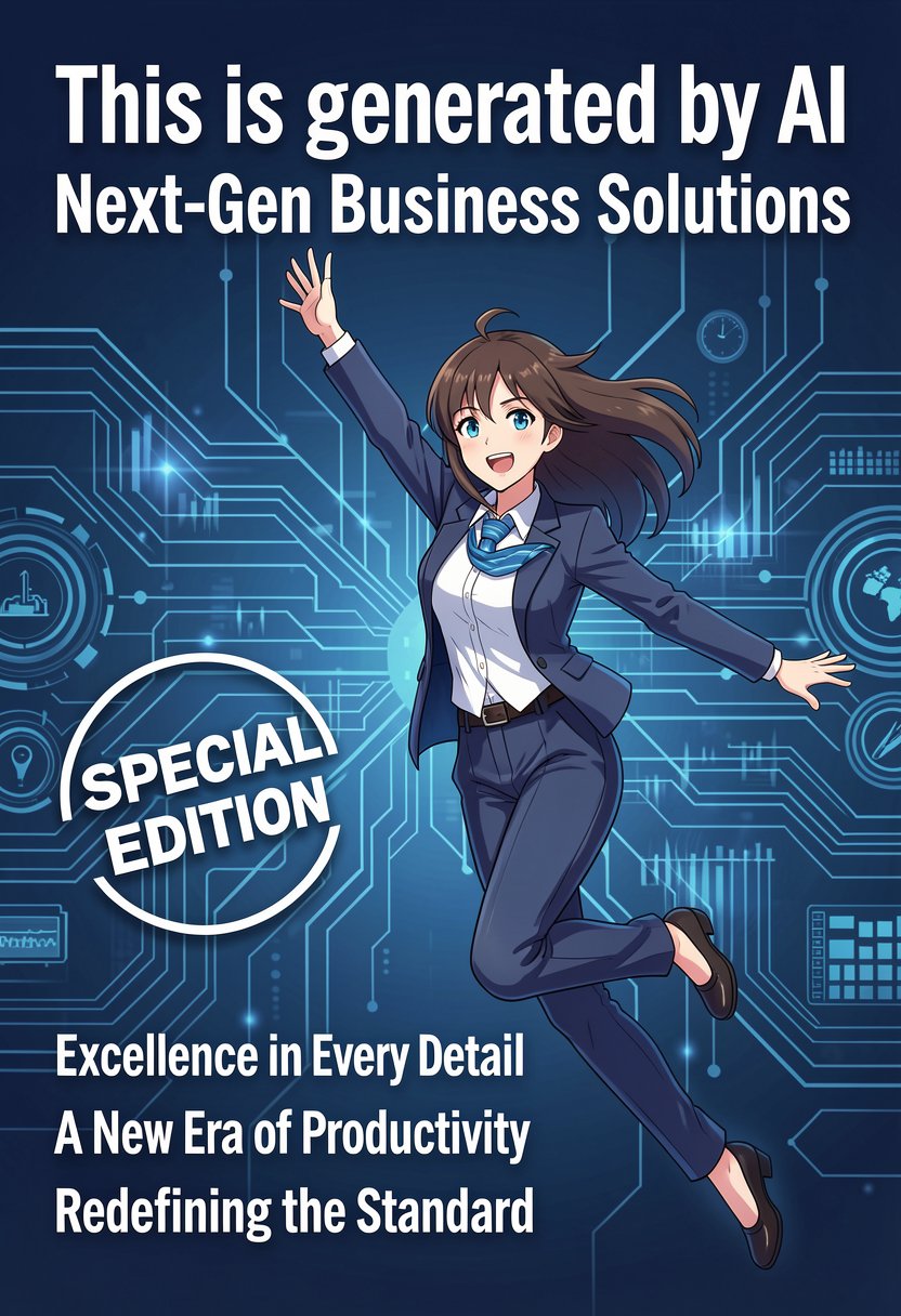Create a cover with a business/tech design that "This is generated by AI" title. Subtitle is "Next-Gen Business Solutions". The letter "Special Edition" is marked by a circle. There is a woman in an anime style wearing a suit and jumping. Write following leads: "Excellence in Every Detail" "A New Era of Productivity" "Redefining the Standard"