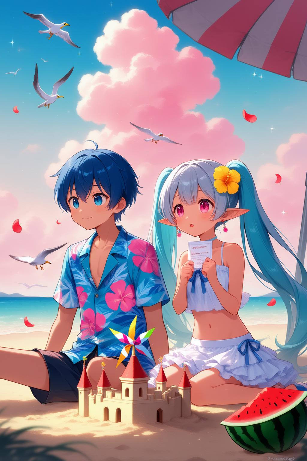 You are an assistant designed to generate high-quality images with the highest degree of image-text alignment based on textual prompts. <Prompt Start> Whimsical anime-style illustration. Medium shot with a warm pastel color palette. ふわふわしたピンクの雲の青空の下、ビーチで男の子と女の子とが隣り合って座っている。 青い短髪の少年は、ピンクの花柄の鮮やかな青のハワイアンシャツと濃い色のショートパンツを緩く着ている。彼はくつろいだ姿勢で座り、少女に優しく微笑んでいる。 少女は銀青色の長いツインテールと妖精のような耳を持ち、袖なしの白いクロップトップと短いフリルスカートを身につけ、髪には黄色い花を挿している。彼女は小さなメモかカードを胸元に抱え、大きなピンクの瞳で少年を見つめている。 二人の間にはカラフルなミニチュア旗とおもちゃの風車が付いた砂の城が築かれ、近くをカモメが飛び交い止まっている。この光景は夏の魔法のような感覚を生み出している。右側では縞模様のパラソルが部分的に影を落としている。漂う花びら、スイカの切り身、きらめきが夢のようなビーチの情景を引き立てている。イラストは柔らかな光、絵画的な質感、そして温もり、驚き、無垢な愛情に満ちた幻想的な雰囲気を帯びている。