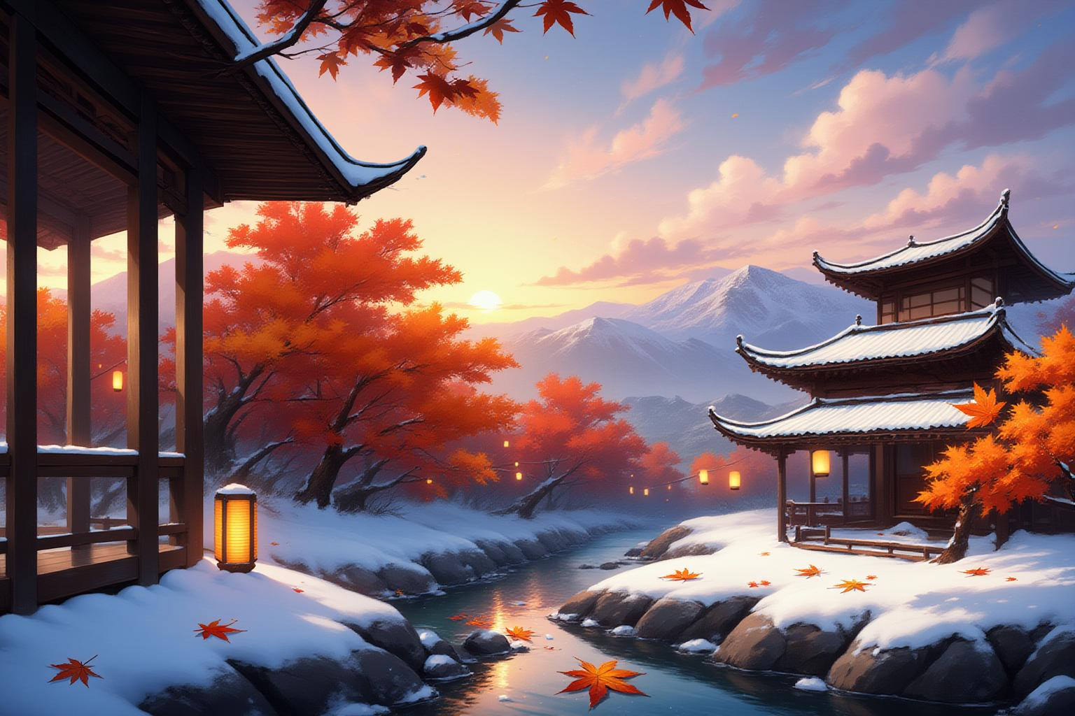 You are an assistant designed to generate high-quality images with the highest degree of image-text alignment based on textual prompts. <Prompt Start> scenery, tree, outdoors, snow, autumn, mountain, veranda, sunset, winter, autumn_leaves, sky, leaf, water, wide_shot, cloud, east_asian_architecture, lingering_maple_leaves, snow-capped_mountains,curved_eaves, half-frozen_stream, tiered_roofline, dusk_hues, paper_lanterns, tranquil_composition A wide shot captures a snow-dusted East Asian veranda overlooking mountains where autumn leaves cling to branches above a half-frozen stream. Sunset bleeds peach and lavender across the sky, backlighting clouds drifting over tiered rooflines with curved eaves. Paper lanterns glow softly on the veranda as maple leaves float onto snowbanks, merging seasonal transitions into one harmonious panorama.