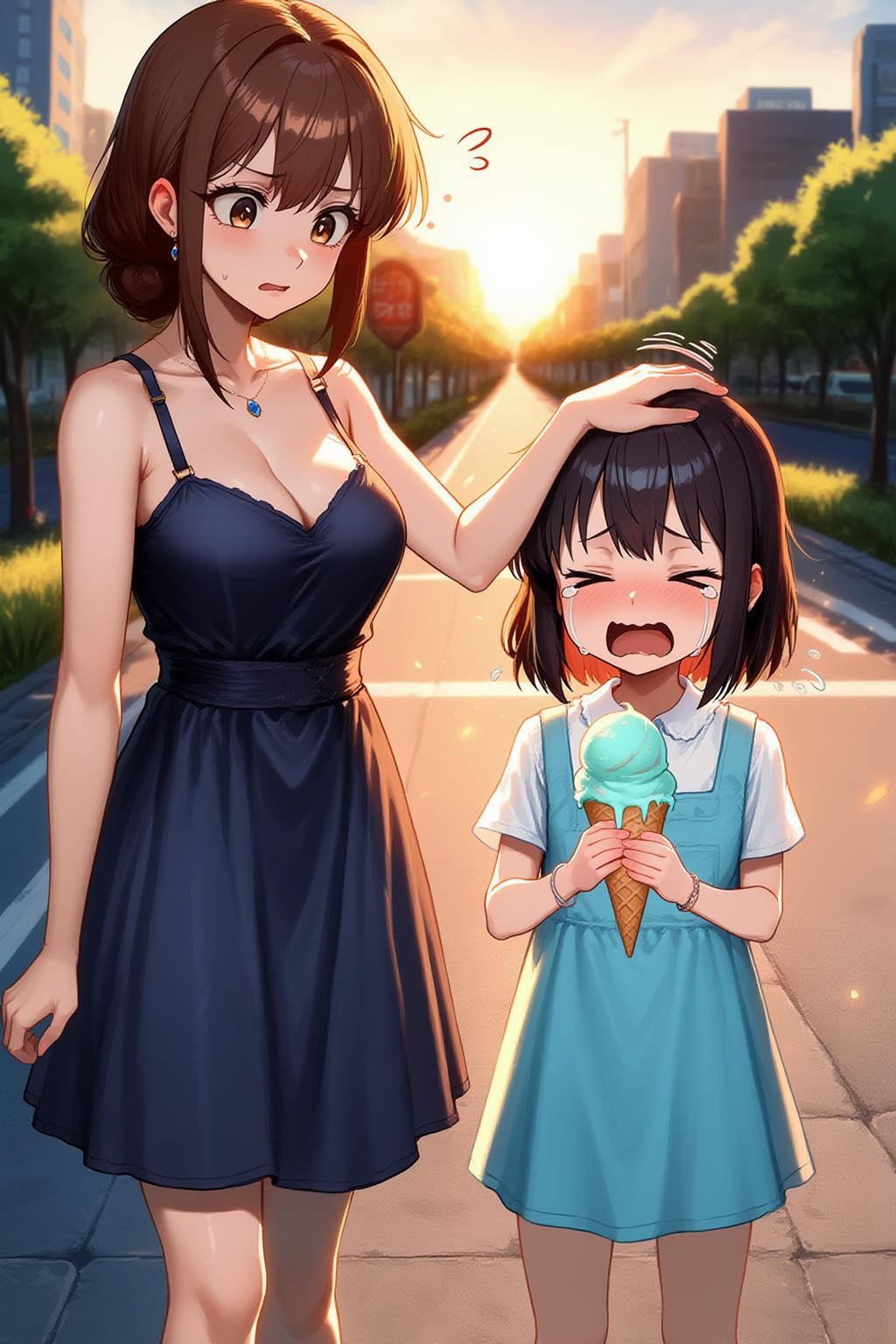 You are an assistant designed to generate high-quality images with the highest degree of image-text alignment based on textual prompts. <Prompt Start> アーティストタグ, 2girls, hand on another's head, onee-loli, outdoors, road, best quality. 女性と女の子が立っています。 左側のドレスを着た成人女性は、困ったような表情で右側の女の子の頭の上に手をのせています。 右側の女の子は泣いています。手にはアイスクリームのコーンを持っています。 道路にはアイスクリームが落ちています。 イラストは夕方の都会で柔らかな光、温もりを帯びている。
