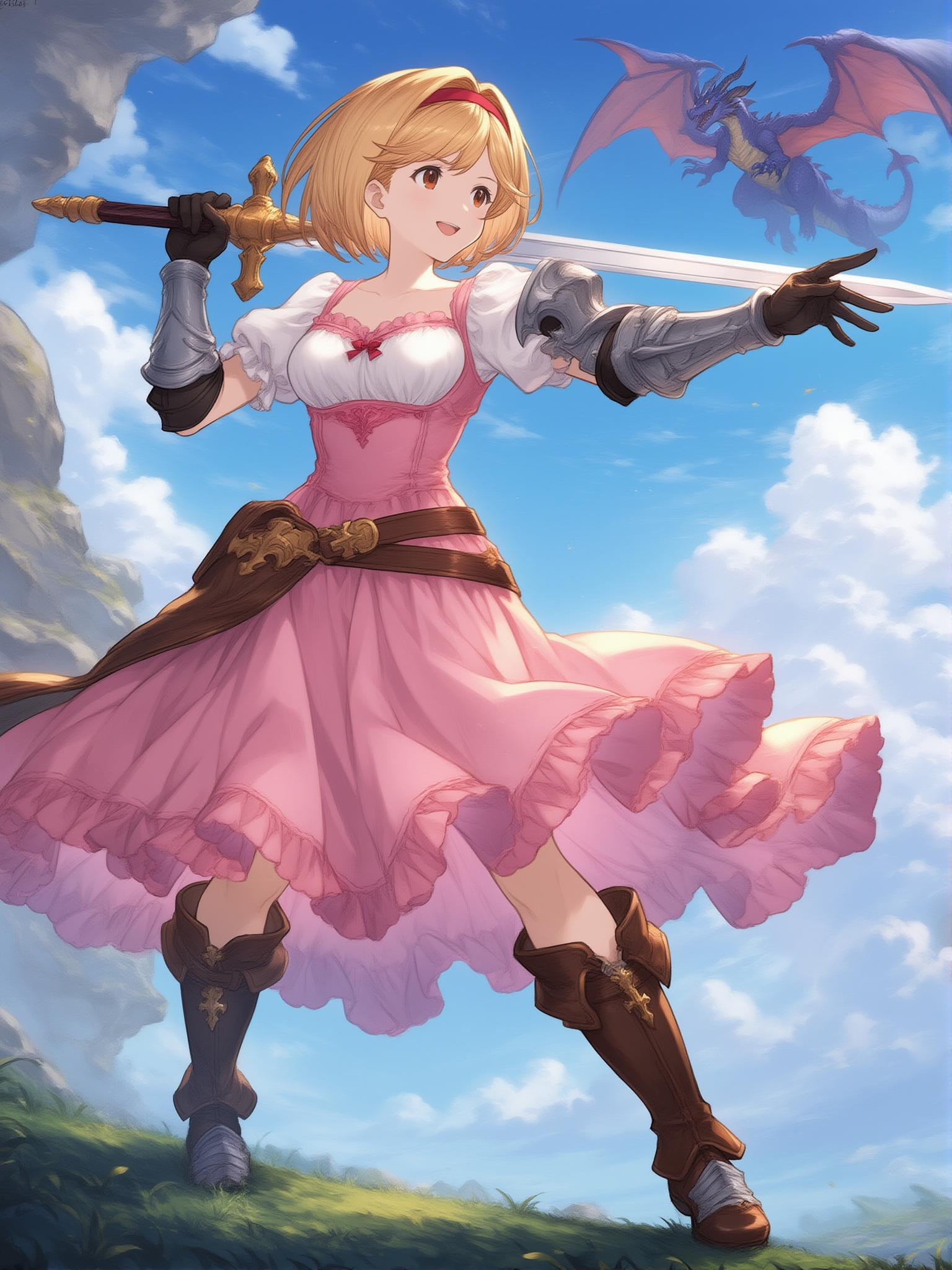 You are an assistant designed to generate high-quality images with the highest degree of image-text alignment based on textual prompts. <Prompt Start> djeeta \(granblue fantasy\), official art, best quality. 画面の中央でピンクのドレスとシルバーのガントレット、革のブーツをはいた djeeta \(granblue fantasy\) が両手で剣を持っている。彼女は手を肩のあたりまであげ、剣先は右側を指している。 青空に白い雲があり、背景にドラゴンが飛んでいる。