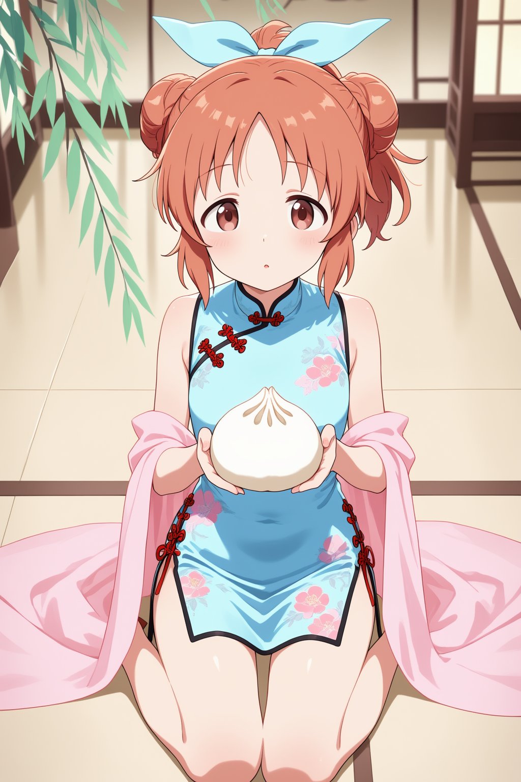 You are an assistant designed to generate anime images based on textual prompts. <Prompt Start> Abe Nana, a young girl with wavy light orange hair styled in double buns and light blue ribbons, sits in wariza, relaxed on a beige tiled floor. She has large brown eyes and fair skin, wearing a short light blue qipao-style dress with pink floral patterns, long sleeves, and a side slit. Holding a white baozi-shaped plushie with bunny ears, she looks directly at the viewer. A soft, blush pink fabric drapes around her. The background is a blurry traditional Chinese-style room with hints of decoration and pale green willow-like branches casting gentle shadows. The image has a depth of field effect, focusing on her while the background is blurred, conveying a calm and intimate atmosphere.