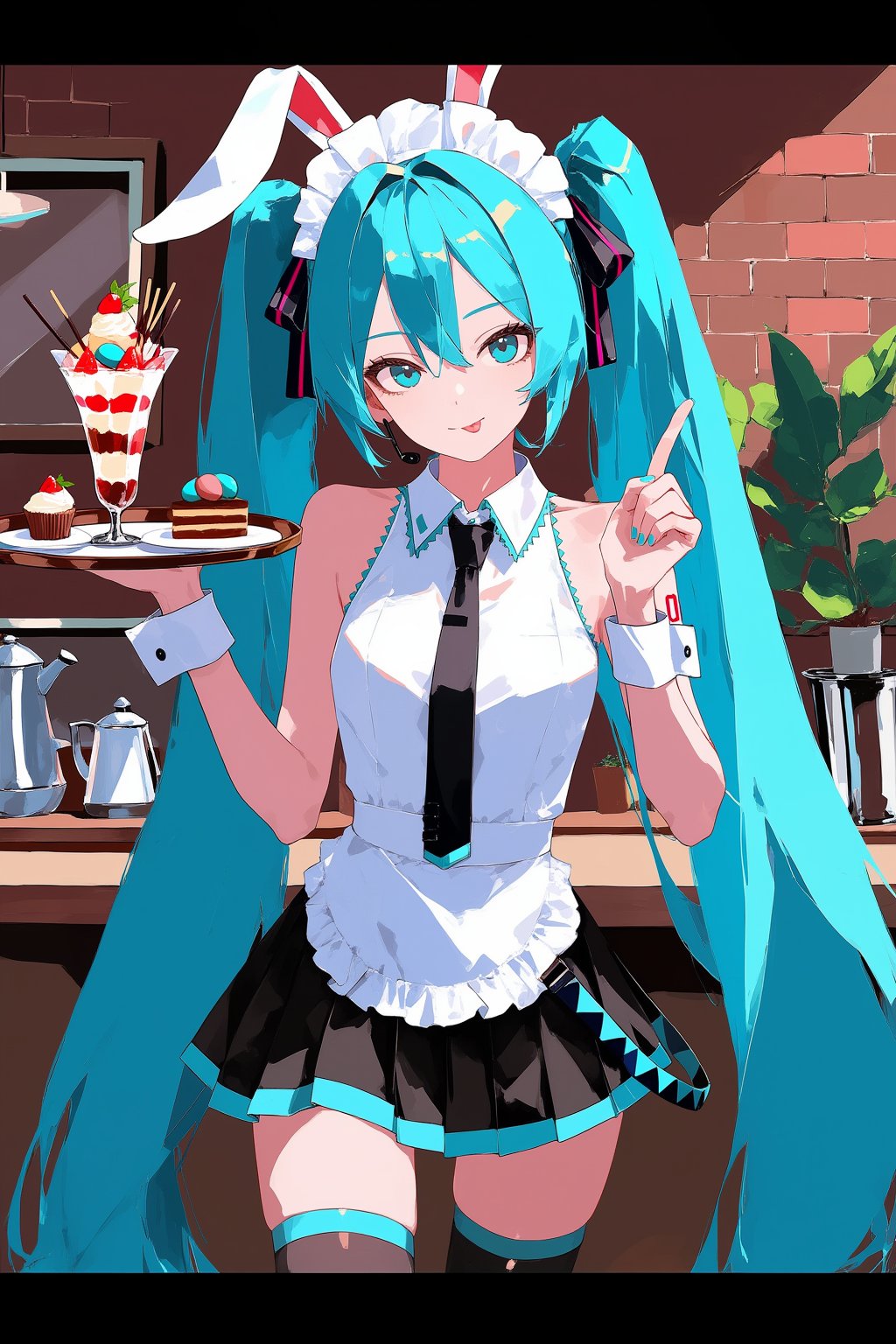 You are an assistant designed to generate anime images based on textual prompts. <Prompt Start> アーティストタグ, Hatsune Miku, 1girl, anime style, vibrant colors, blue hair, very long twintails, blue eyes, rabbit ears (animal ears, fake), maid headdress, black skirt, pleated skirt, black thighhighs, wrist cuffs, black necktie, holding tray, holding food (cake, macaron, cupcake, parfait, pocky, fruit), café indoor scene (brick wall, display case, coffee pot, potted plant), hair between eyes, tongue out, index finger raised, number tattoo & shoulder tattoo, looking at viewer, front-facing, medium shot, soft lighting, cozy atmosphere, masterpiece, best quality, amazing quality