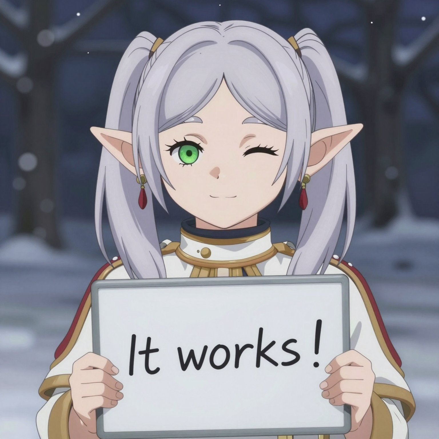 Anime style. # person 芙莉莲's upper body. - appearance: silver hair and green eyes - facial expression: closing one eye with slight smile - objects: She is holding a white board with handwritten "It works!" - garment: a coat with a red jewelry on her neck button # background The background features a snowy night with bokeh.