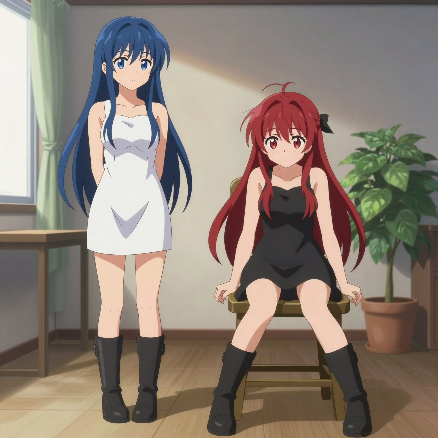 Anime style. There are two girls in a room. One is standing, the other is sitting on a stool. The soft lighting creates a humorous atmosphere. On the left, Kotonoha Aoi, with long blue hair, is standing. She has her arms behind her back, wearing a white dress and knee boots. She is standing. On the right, Kotonoha Akane, with long red hair, is sitting on a stool with her legs spread and leaning forward. She has her arms stretched out in front of her and her hands on the stool. She is wearing a black dress and knee boots. In the background are a window, curtains, a table, and a potted plant.