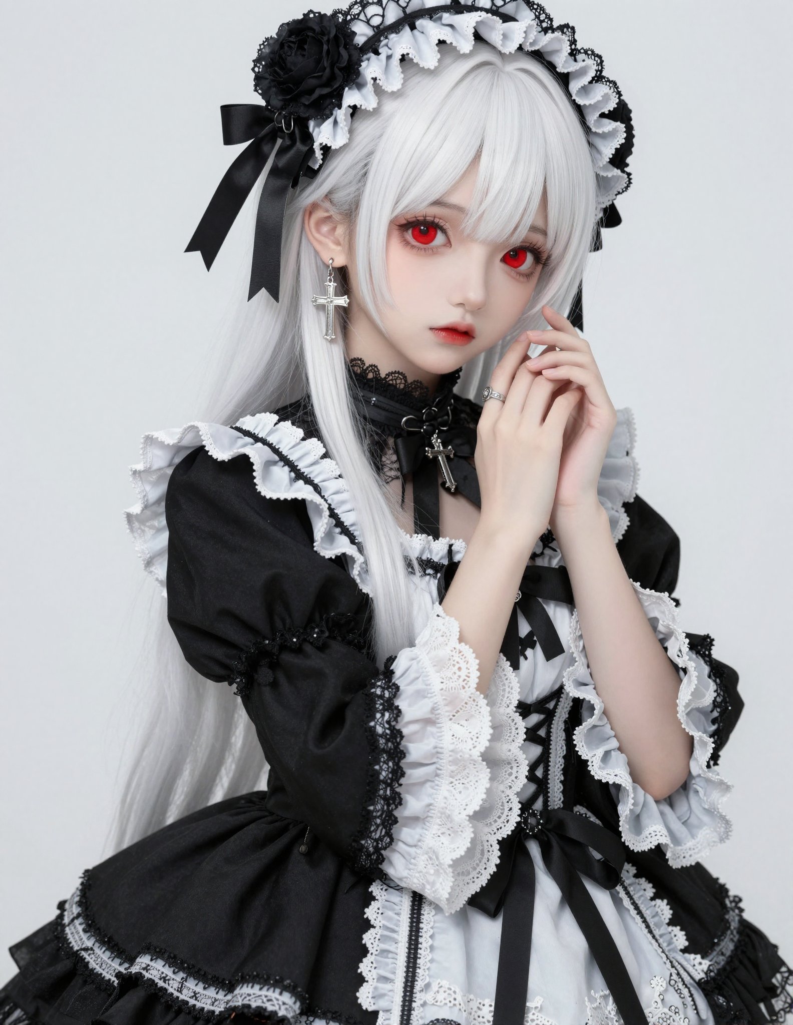 anime style young woman, slender body, long white hair with bangs and an elaborate frilly headpiece, fair skin, large red eyes, wearing a black and white frilly gothic lolita dress with intricate ruffled details, posing with hands together near her face, adorned with a silver cross earring and a silver ring, against a plain light background, mood is solemn and elegant, soft lighting highlighting the delicate textures of the frills and hair, close-up shot focusing on the character's detailed features and accessories