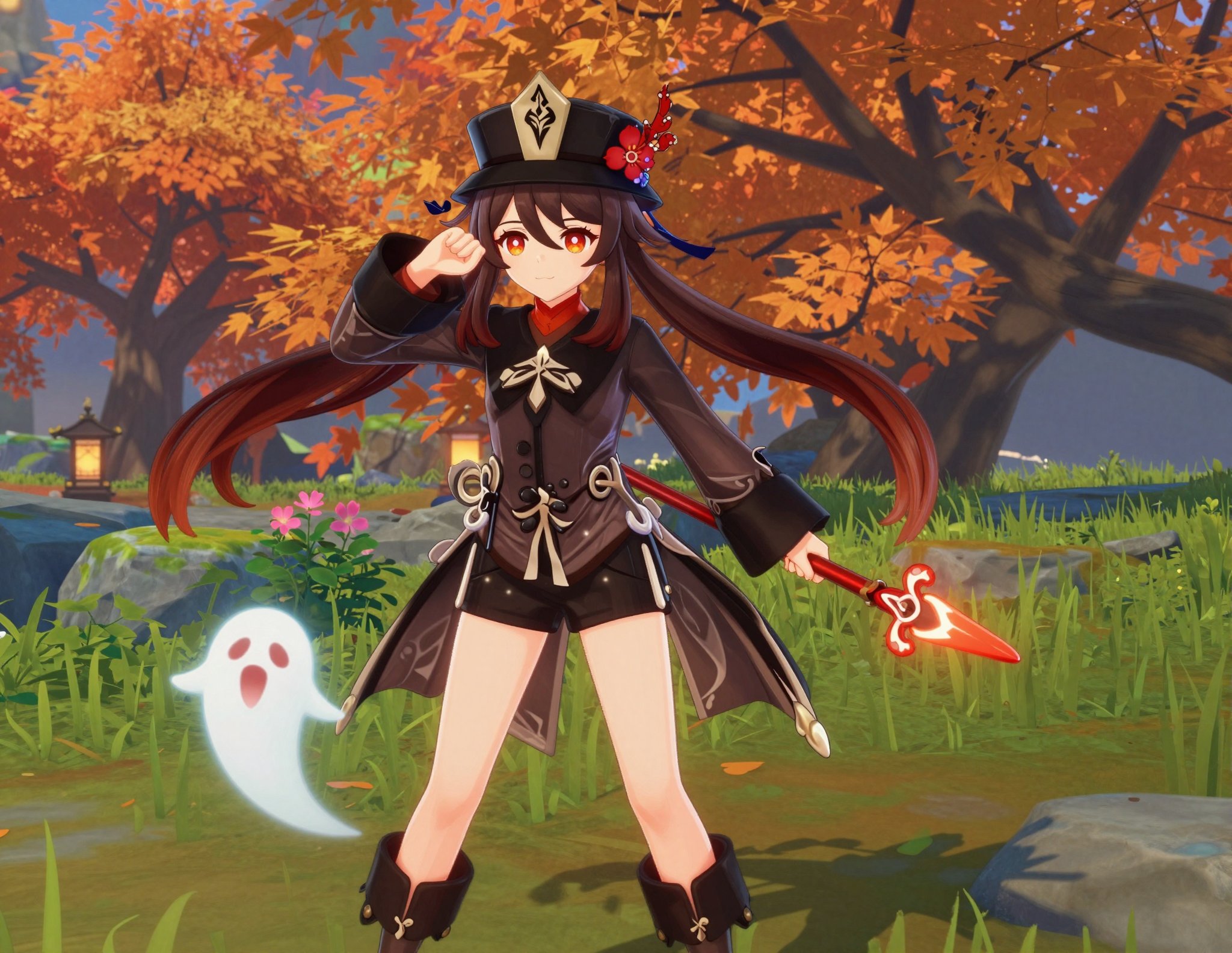 The game screen capture style. The Genshin Impact character, Hu Tao(胡桃), is depicted in a lively pose on the right side of the image. She wears a black outfit with red and white accents on the sleeves and skirt lining. Her long, dark brown hair flows in the wind and she wears a distinctive flower-adorned hat. Her right hand is near her face, and in her left she holds a glowing red polearm. A distinctive white ghost floats at her feet. The background is a rich autumn landscape, with shrubs and trees colored in orange and red, creating depth. The ground is covered with mossy rocks and lush vegetation, and is decorated with a small lantern and plants with pink flowers. A warm light shines throughout, highlighting the character.