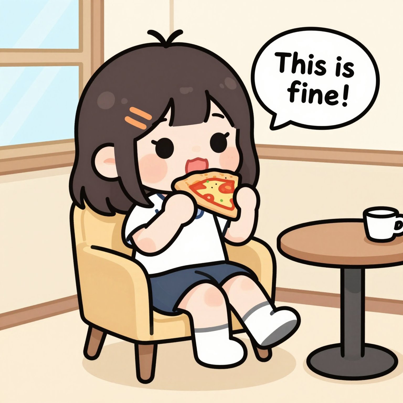 The illustration of a chibi girl sitting in a chair eating a piece of pizza. She is saying "This is fine!" in a speech bubble. There is a table and a window in the indoor room.