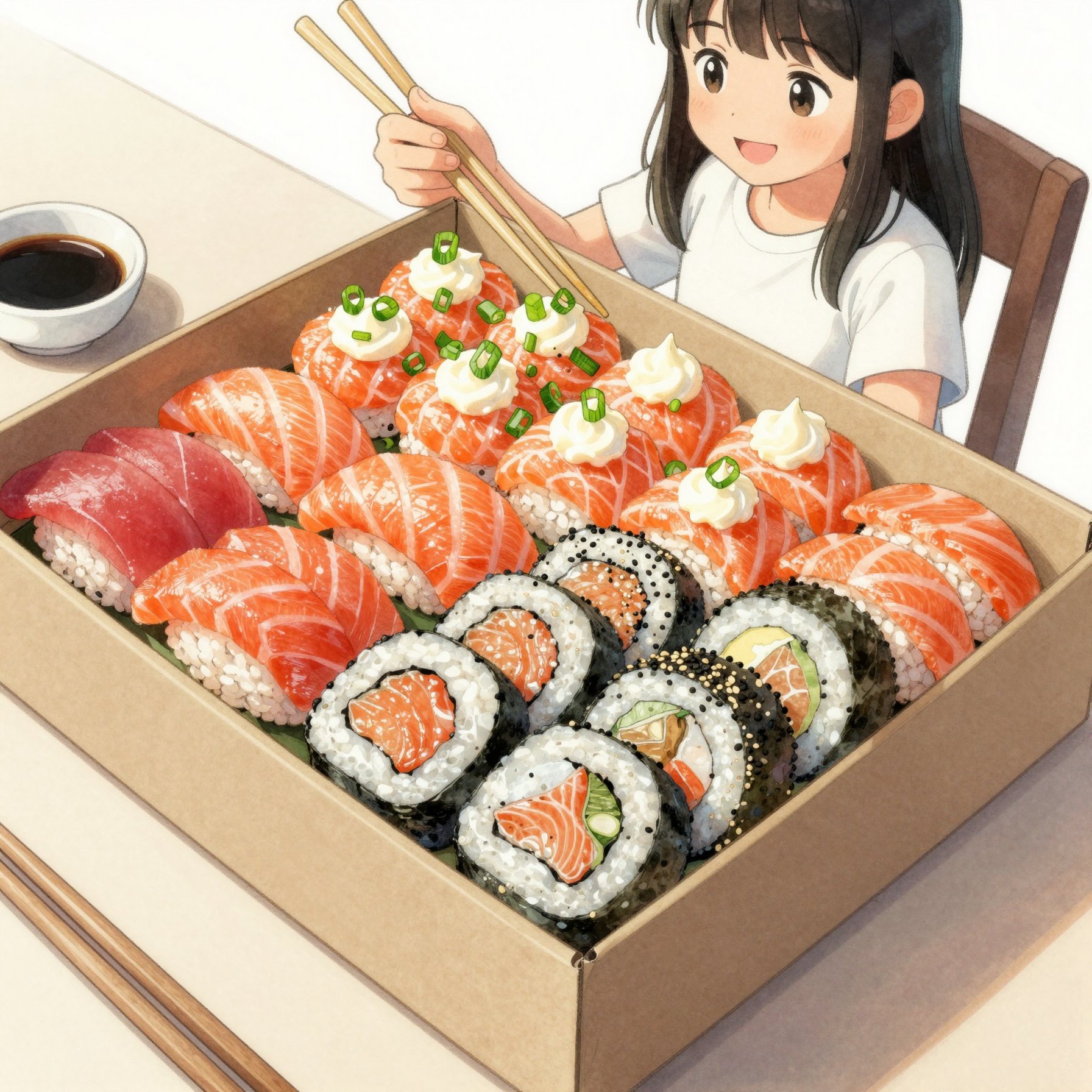 This illustration combines pen and ink drawing with watercolor techniques, featuring highly saturated colors. A girl sits on a chair, smiling as she holds chopsticks. A vibrant, an abundant tuna and salmon sushi and sashimi platter neatly arranged within a simple, light brown cardboard takeaway box. The subtle texture of the box's matte surface provides a minimalist backdrop, allowing the vibrant colors of the sushi to truly pop. The left side features a meticulously arranged, full tuna and salmon sashimi rose with delicate, orange-pink layers, accompanied by two simple, thick slices of salmon. To the right, a delightful array of individual salmon-wrapped rice balls are generously topped with swirls of creamy white cream cheese and garnished with bright green, finely chopped scallions or chives. Below these, two organized rows of inside-out salmon and cream cheese sushi rolls (uramaki) showcase their fluffy white rice exteriors, heavily speckled with contrasting black sesame seeds, revealing the rich salmon filling in their cleanly cut cross-sections. The scene is illuminated by soft, diffused natural light, creating gentle highlights on the creamy fillings and the glossy salmon, enhancing the appetizing appeal without harsh shadows. The edges of the box are slightly visible, grounding the scene and emphasizing its 'to-go' nature. The box is placed on a table. There is a soy source in a saucer on the left side of the box.