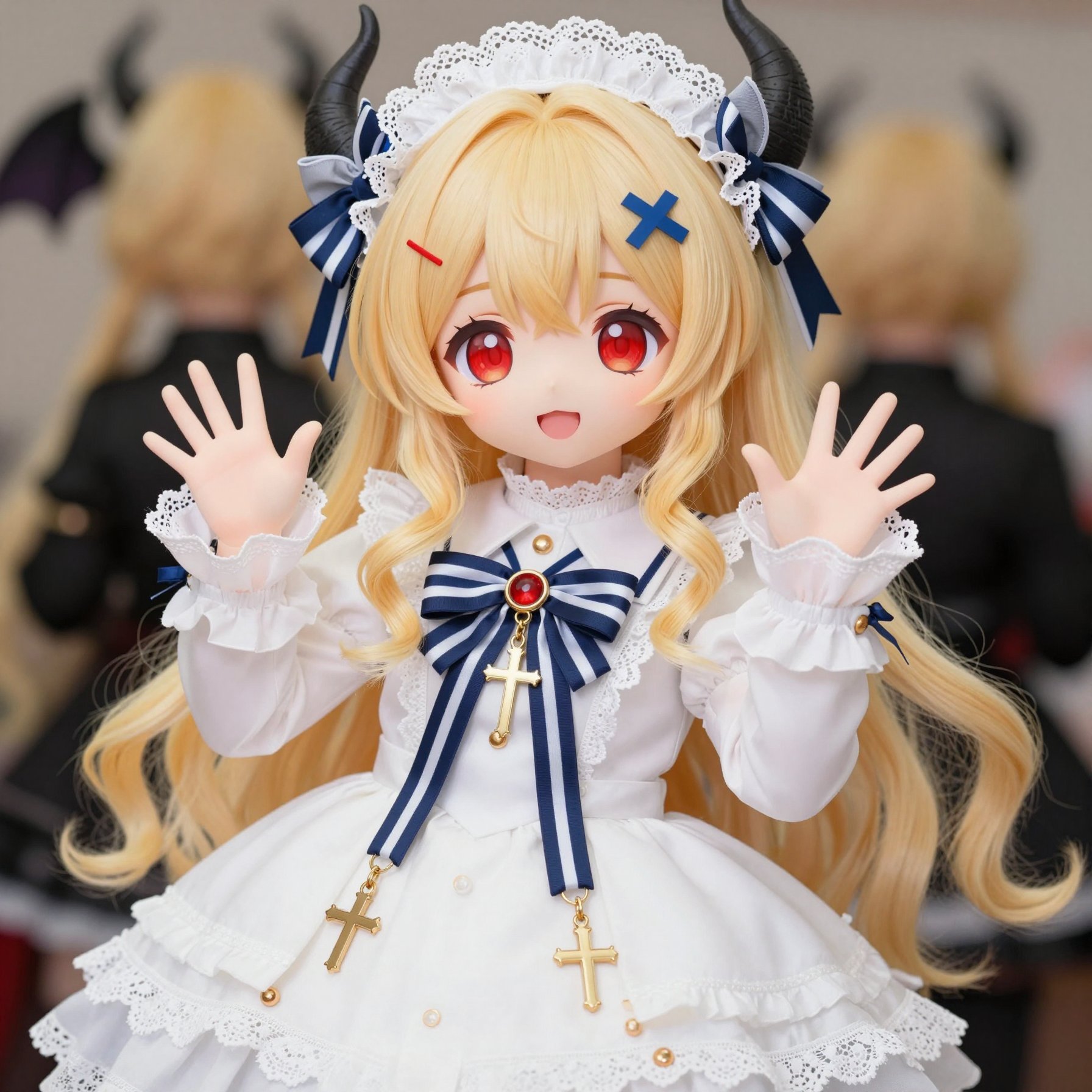# Core Feature - Character Type: A cute female figure in a chibi (Q-style) aesthetic. - Facial Features: Large red eyes, a small nose and mouth, long, wavy golden hair, and bangs. - Headwear: A large bow on her head, made of white, gray, and dark blue striped fabric. A blue cross and two red lines are affixed to her forehead. - Pose: Left hand waving, right hand making a "V" sign. # Clothing Details - Overall: Wears a white, multi-layered ruffled dress. - Neckline and Cuffs: Delicate white lace trim on the neckline and cuffs. - Chest Accessory: A blue and white striped bow tied at the chest, with a red round gemstone in the center. - Pendant: Two dark blue ribbons hang from the bow, each ending in a gold cross pendant. - Other: Gold buttons adorn the dress. # Background Elements There is a charactere in the blurry background. - Environment: Another character is faintly visible in the background. This character has golden hair and black demon/bat-wing-like horns, and wears black clothing. # Style and Texture - Style: Japanese anime style, emphasizing cuteness and refinement. - Materials: The texture of the clothing fabric, the delicacy of the lace, and the luster of the metallic pendants all need to be depicted.