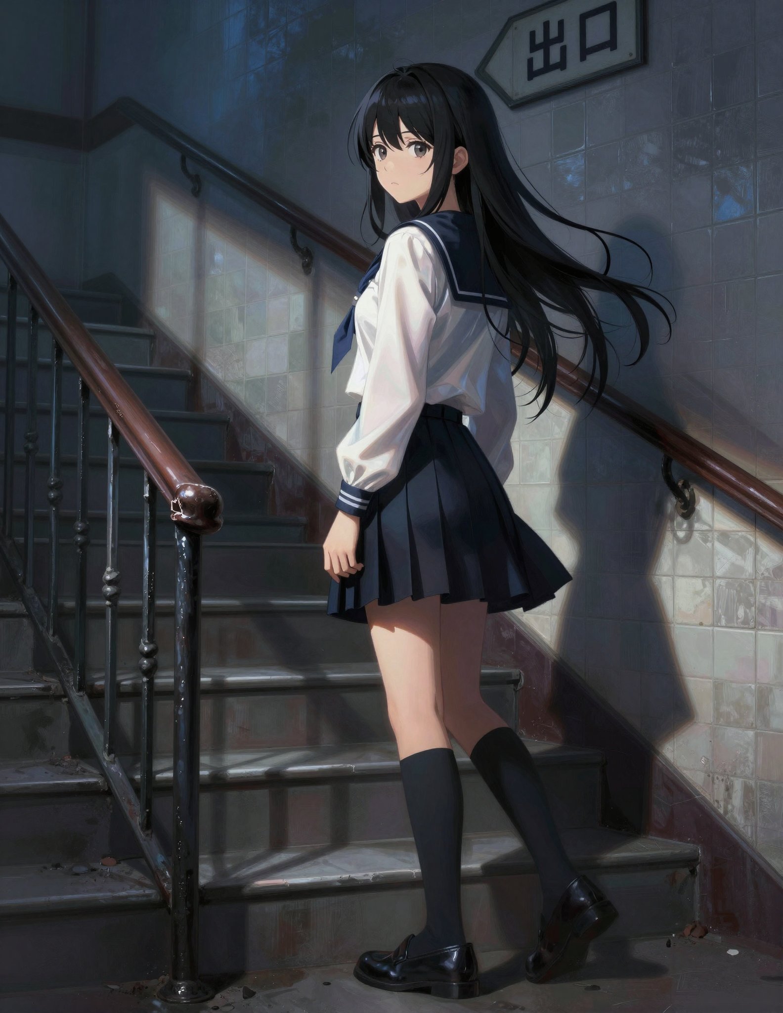 Atmospheric anime illustration of a beautiful young woman with long flowing black hair standing on an old school staircase, looking back over her shoulder directly at the viewer with an enigmatic expression. Character wears a classic school uniform consisting of a white blouse with navy blue tie, dark pleated skirt, black knee-high socks and leather shoes. Dramatic cinematic lighting from above creates strong contrast between illuminated figure and shadowy staircase surroundings, casting sharp shadows across the tile walls. Environment features worn ceramic tiles in checkerboard pattern on walls and steps, wrought iron handrail with peeling paint, and a vintage directional sign mounted on the wall showing Japanese characters for "出口". Thick-coated 3D texture rendering with visible brushstrokes creates tangible surface quality on tiles, fabric and metal. Cool color palette dominated by deep blues and grays with strategic highlights in warm tones on skin and hair. Highly detailed illustration style blending anime aesthetics with painterly realism, emphasizing the visual impact of light and shadow interplay. Mysterious, contemplative mood with slight gothic undertones, professional digital painting with exceptional material rendering.