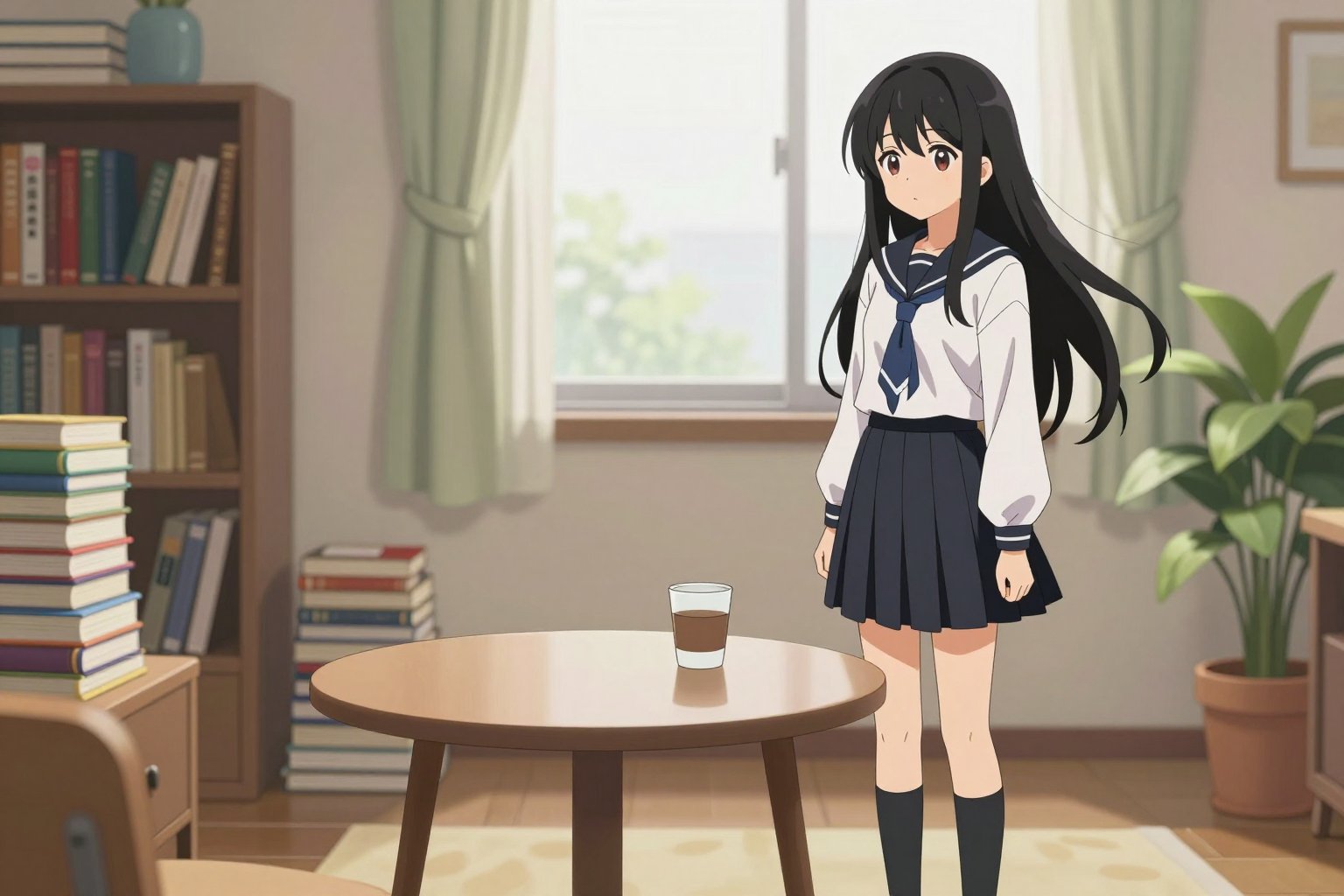 # composition ## right A girl with long flowing black hair standing on the right side of the table. The girl wears a classic school uniform consisting of a white blouse with navy blue tie, dark pleated skirt, black knee-high socks. ## middle There is a round mini table on the center of the image. There is a empty coffee cup on the table. ## left There is a bookshelf and piled books in the one. # background In the living room, there are a window, curtains, bookshelfs, piled books, a table, and a potted plant. # style Atmospheric anime illustration. The soft lighting creates a humorous atmosphere.