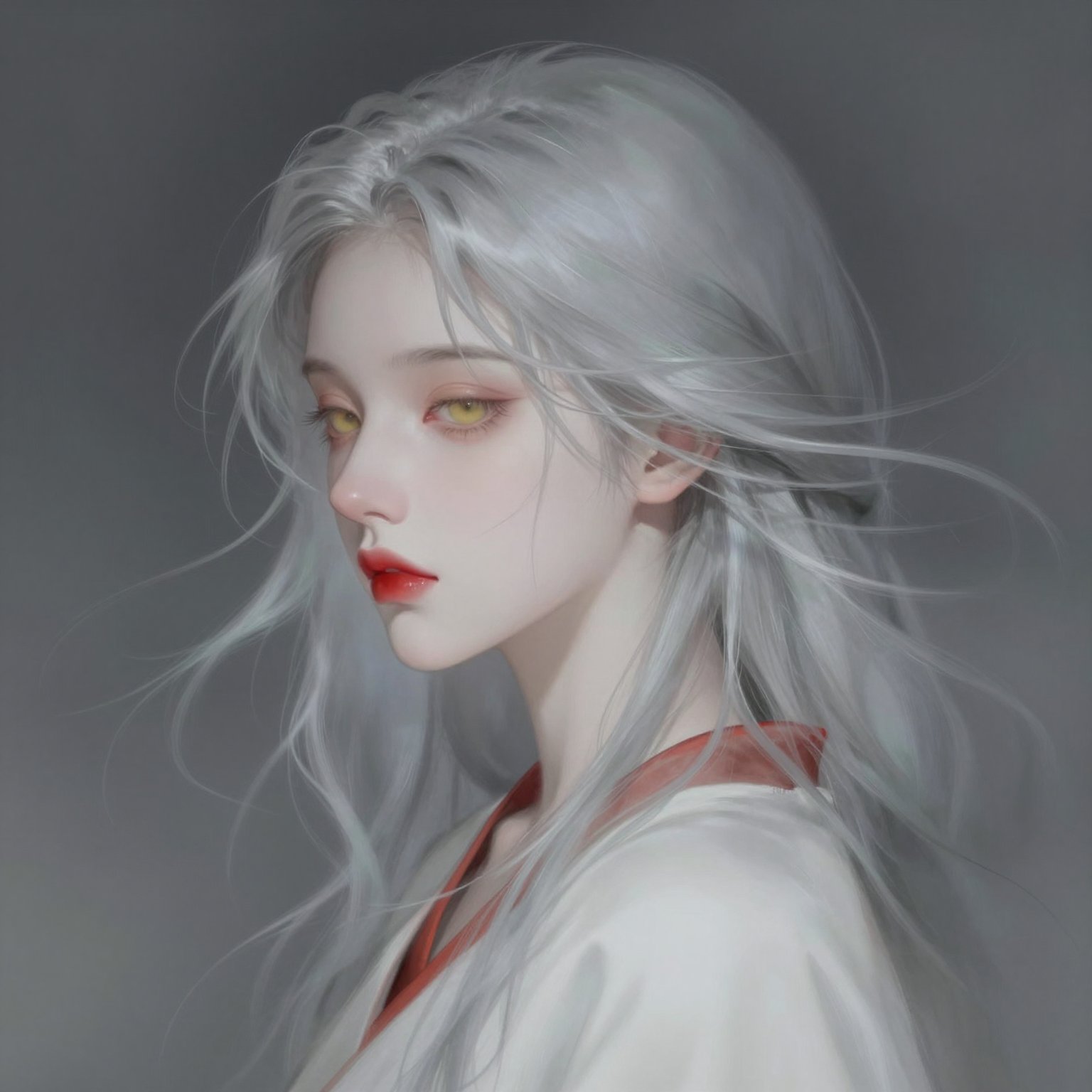 A illustration of close-up profile of a young woman with ethereal, almost otherworldly qualities. The subject has pale, flawless skin and striking yellow eyes that are slightly downcast, giving her an introspective appearance. Her long, wavy hair is a silver-gray color, flowing dynamically and appearing almost as if its caught in a gentle breeze, adding a sense of movement to the image. She has full, red lips that contrast sharply with her pale complexion. She is wearing a white garment with a red collar, which is slightly visible at the bottom of the frame. # background The background is a dark, gradient gray, which helps to highlight the subjects luminous features and hair. # lighting The lighting is soft and diffused, casting gentle shadows that enhance the three-dimensionality of her face and hair. The overall mood of the image is serene and mystical, with a focus on the delicate and ethereal qualities of the subject. # style This is a digital painting in a realistic, semi-abstract style. Use smooth, blended brushstrokes to create a sense of realism while maintaining a slightly fantastical atmosphere.