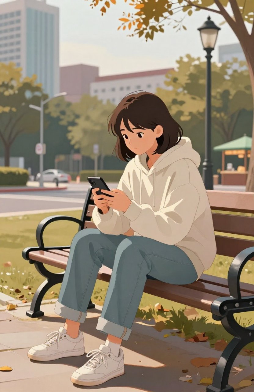 # style of painting - anime # person - garment: casual wear (jeans, hoodie) - foot: shoes (white sneakers) - pose: sitting on a bench, looking at her phone - hair length: medium - facial expression: calm, slightly focused # background - location: outdoor ## left - skyscraper ## middle - city park bench, street view ## right - street lamp, small cafe in the distance # settings - time of day: late afternoon - season: autumn - lighting: soft, natural light, slight golden hour glow