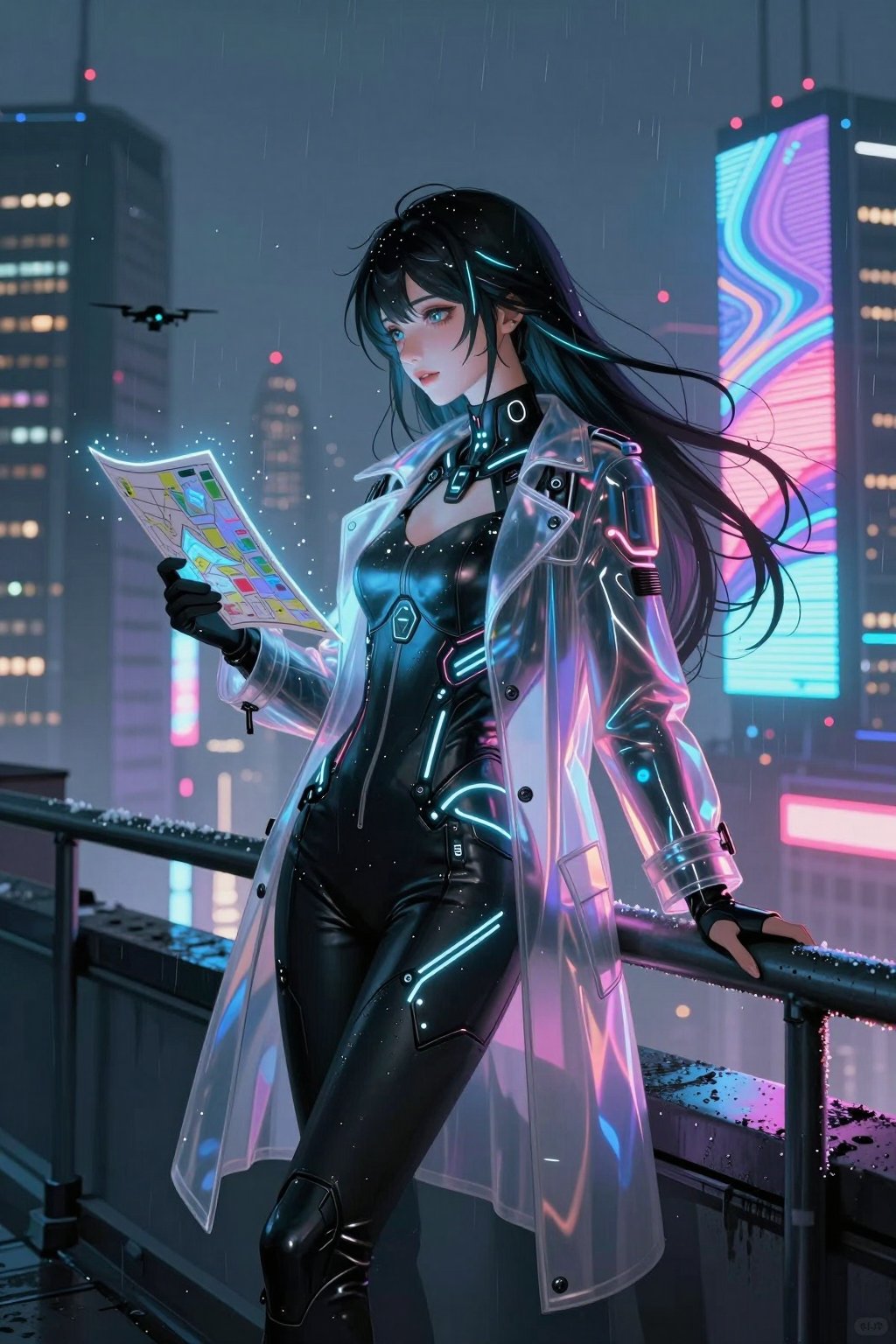 A girl holding a M4 assault rifle in her right hand, is stainding in the apocalypse city. She is looking at side. She is wearing a hooded jacket, a skirt and boots with a backpack. # background The background is a dark, gradient snowing gray. Draw following objects: - disfigured road - disfigured buildings - many broken cars, tanks - debris and rubble - a broken traffic light # style This is a digital painting in an anime but semi-realistic style. Dramatic cinematic lighting and mysterious, contemplative mood. Draw the M4 assault rifle in detail.