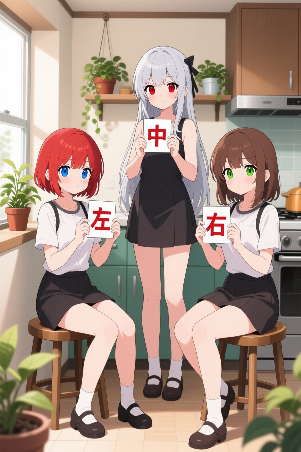 # person There are three girls in a room. - left: short red hair and blue eyes. She is sitting on a stool holding a card with the word "左" written on it. - middle: long silver hair and red eyes. She is standing and holding a card with the word "中" written on it in both hands. - right: medium brown hair and green eyes. She is sitting on a stool and holding a card with the word "右" written on it. # background potted plants and a kitchen. # style Anime style.