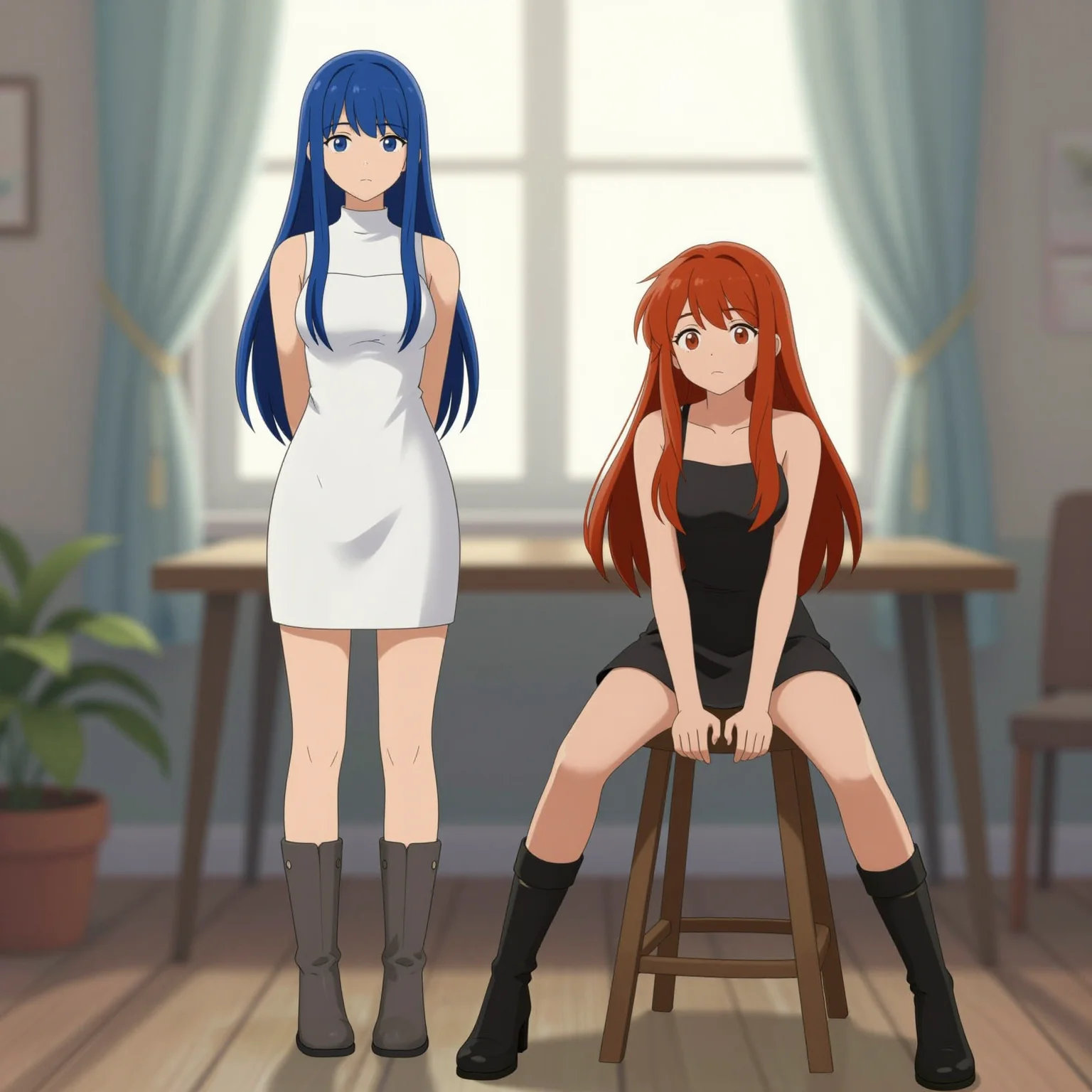 # style Pure illustration. The soft lighting. # character There are two girls in a room. One is standing, the other is sitting on a stool. ## character 1 A long-haired girl with blue hair wearing a white dress and knee boots is standing facing forward on the left. She hides her hands behind her back. ## character 2 On the right, a short girl with long red hair is sitting on a wood stool with her legs spread and leaning forward. Her arms are placed in front of her and her hands on the stool. She is wearing a black dress and knee boots. She is facing front. Her height is short. # background In the background are a window, curtains, a table and a potted plant.