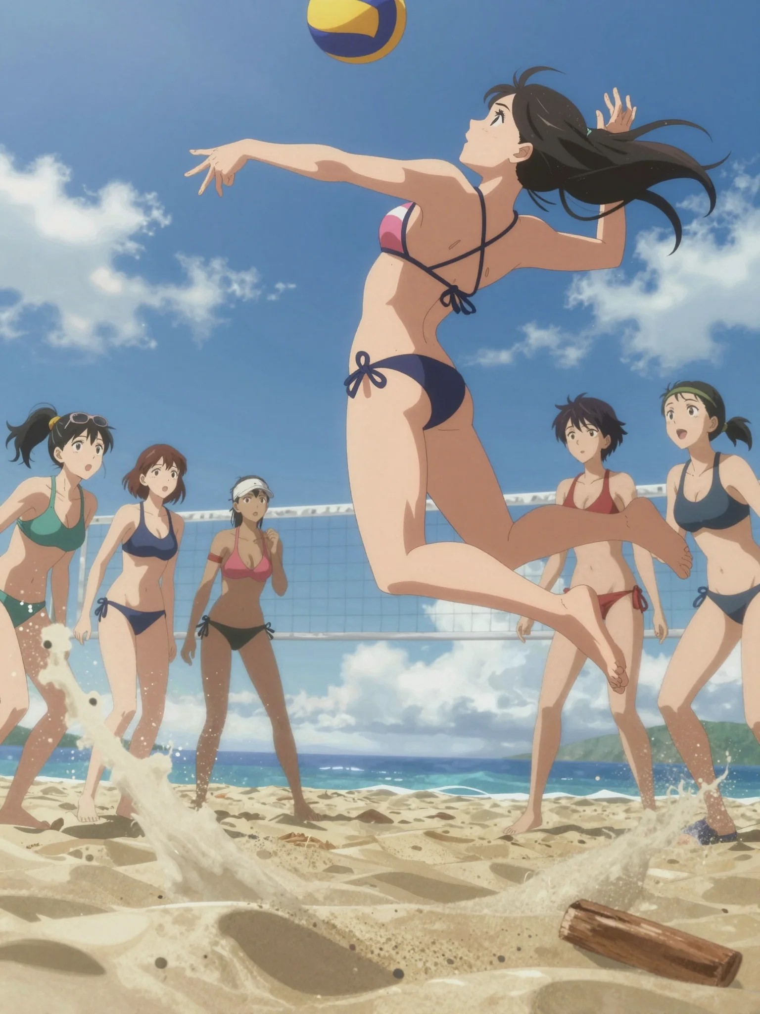 Anime key visual. A group of girls playing beach volleyball. The main character is jumping for a spike, dynamic mid-air pose. She is wearing a revealing string bikini that defies physics. Sand flying, water splashing, detailed anatomy. # background high contrast sunlight, sky, sea, valleyball pole, valleyball net