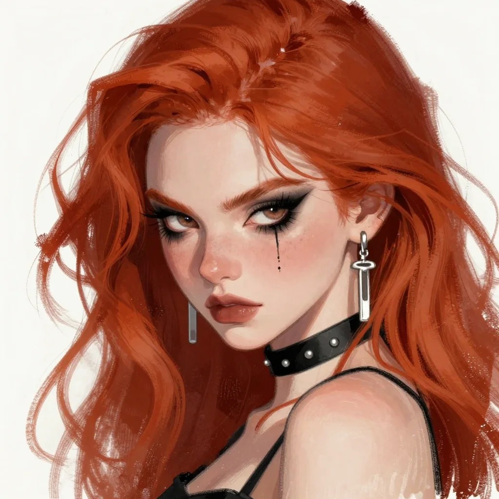 A gritty fantasy illustration of a --- An redhead girl with arrogant face expression, heavy makeup, smokey eyes, from side, tilted head, bright eyes, UwU, black choker, long silver earrings # tags Concept art, rough texture, hatching, colorful, made with soft pastel inks,