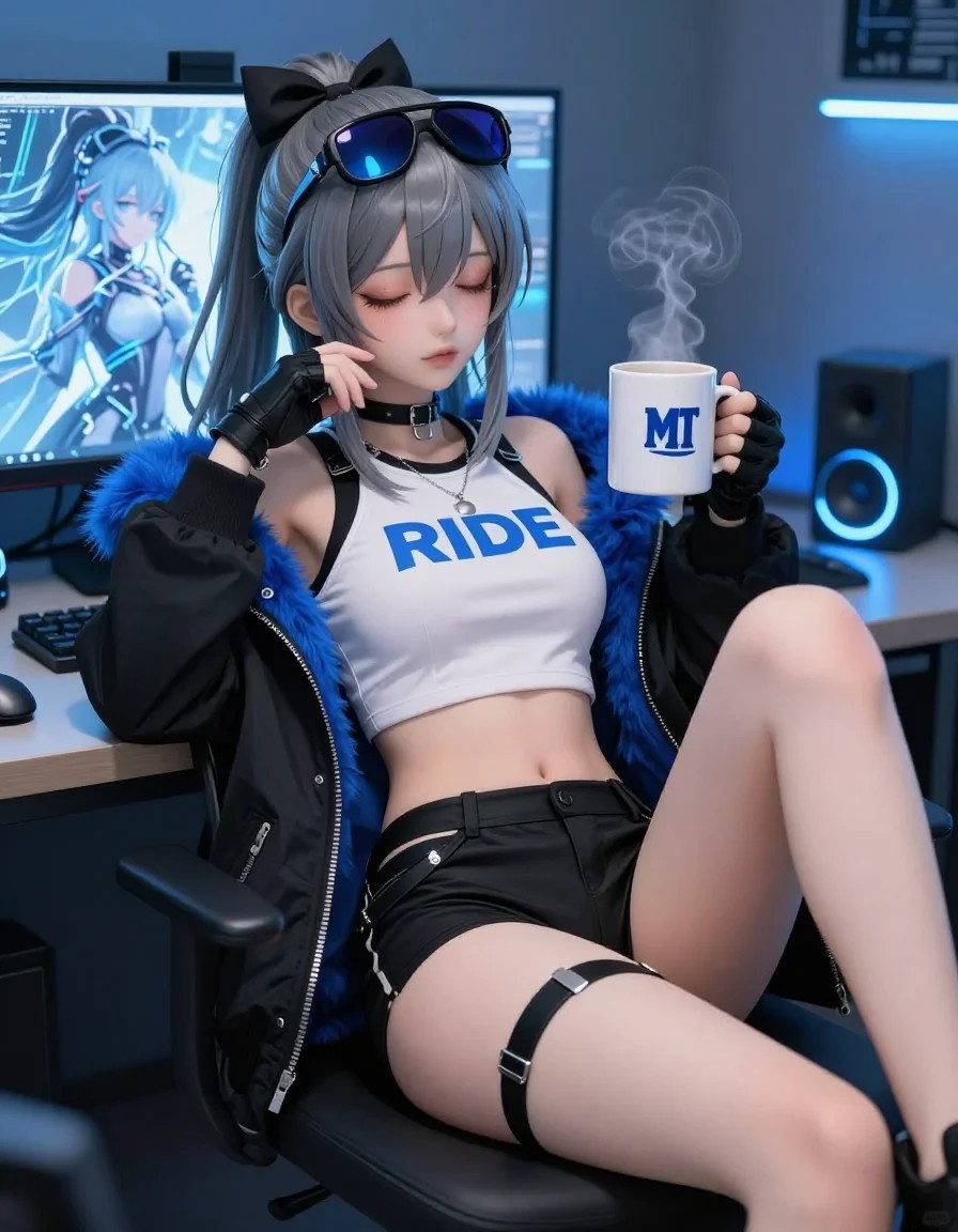 Anime style. An Anime girl with realistic textures reclines in a cozy, tech-infused workspace bathed in a cool, ambient blue light. She has silky grey hair styled into a high ponytail secured with a black bow, with sleek, reflective black sunglasses resting atop her head—shimmering with the glow of the screen behind her. Her outfit blends casual and edgy vibes: a white crop top with bold blue "RIDE" lettering across the chest, layered under a black zip-up jacket featuring plush blue fur trim on the collar and metallic buttons that catch the light. Fingerless black gloves encase her hands, one holding a white coffee mug emblazoned with the MIT logo—steam delicately curling upward from the rim, hinting at warmth. Her lower body showcases tight black legwear: high-waisted shorts with adjustable straps that cinch her thighs and waist, emphasizing her relaxed pose as she lounges with legs playfully bent. Her left hand rests near her cheek, fingers softly grazing her skin, eyes half-lidded in a serene, contemplative expression that conveys calm focus. The background reveals a modern workspace: a monitor displays an anime-style character with frosty, futuristic details, a sleek keyboard and mouse sit beside it, and wireless speakers with glowing blue LED accents add to the digital ambiance. The soft blue lighting casts gentle shadows across smooth skin, silky hair, and textured fabric, enhancing the cozy yet stylish atmosphere of a personal creative sanctuary. Every detail—from the subtle sheen of the mug to the precision of the jacket’s stitching—blends anime’s vibrant storytelling with realistic rendering, creating an immersive scene where comfort and tech culture harmonize. Anime style.